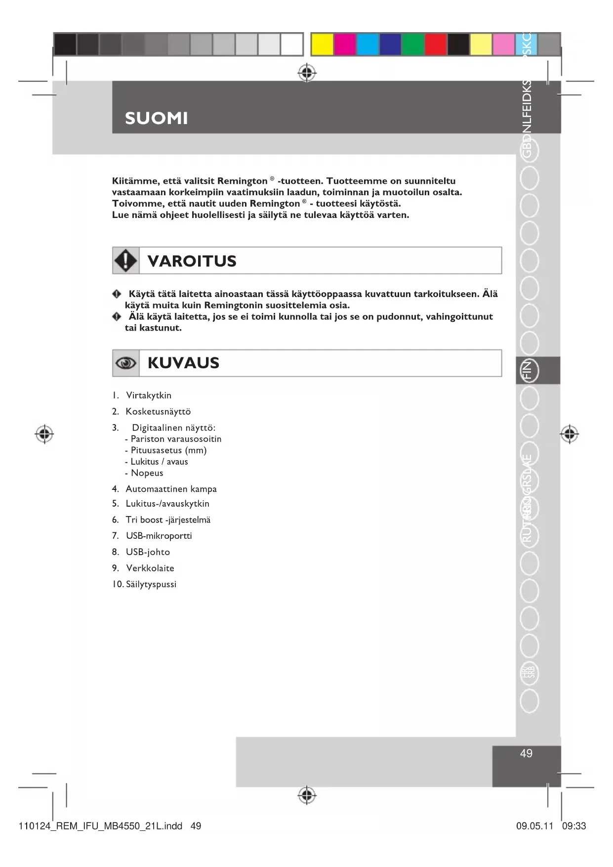 Älä käytä laitetta, jos se ei toimi kunnolla tai jos se on pudonnut, vahingoittunut tai kastunut. KUVAUS 1. Virtakytkin2. Kosketusnäyttö3. Digitaalinen näyttö:- Pariston varausosoitin- Pituusasetus (mm)- Lukitus / avaus- Nopeus4. Automaattinen kampa5. Lukitus-/avauskytkin6. Tri boost -järjestelmä7. USB-mikroportti 8. USB-johto9. Verkkolaite10. Säilytyspussi110124_REM_IFU_MB4550_21L.indd 49 09.05.11 09:33SUOMI