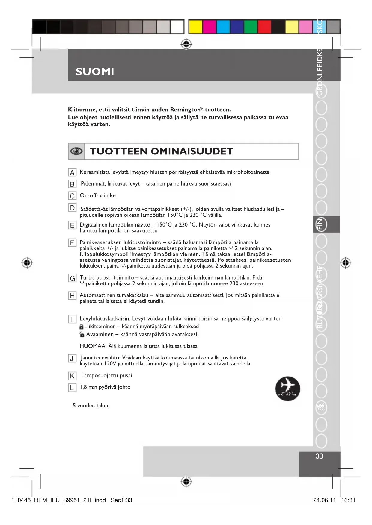 1,8 m:n pyörivä johto 5 vuoden takuu120 - 240VMULTI VOLTAGE110445_REM_IFU_S9951_21L.indd Sec1:33 24.06.11 16:3134