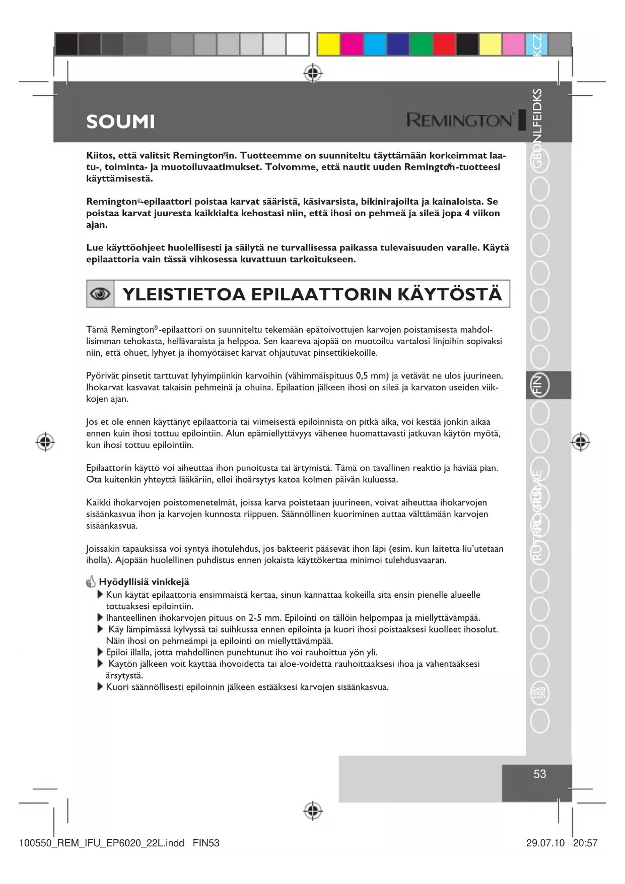 Käytön jälkeen voit käyttää ihovoidetta tai aloe-voidetta rauhoittaaksesi ihoa ja vähentääksesi ärsytystä. Kuori säännöllisesti epiloinnin jälkeen estääksesi karvojen sisäänkasvua. 100550_REM_IFU_EP6020_22L.indd FIN53100550_REM_IFU_EP6020_22L.indd FIN53 29.07.10 20:5729.07.10 20:57SOUMI