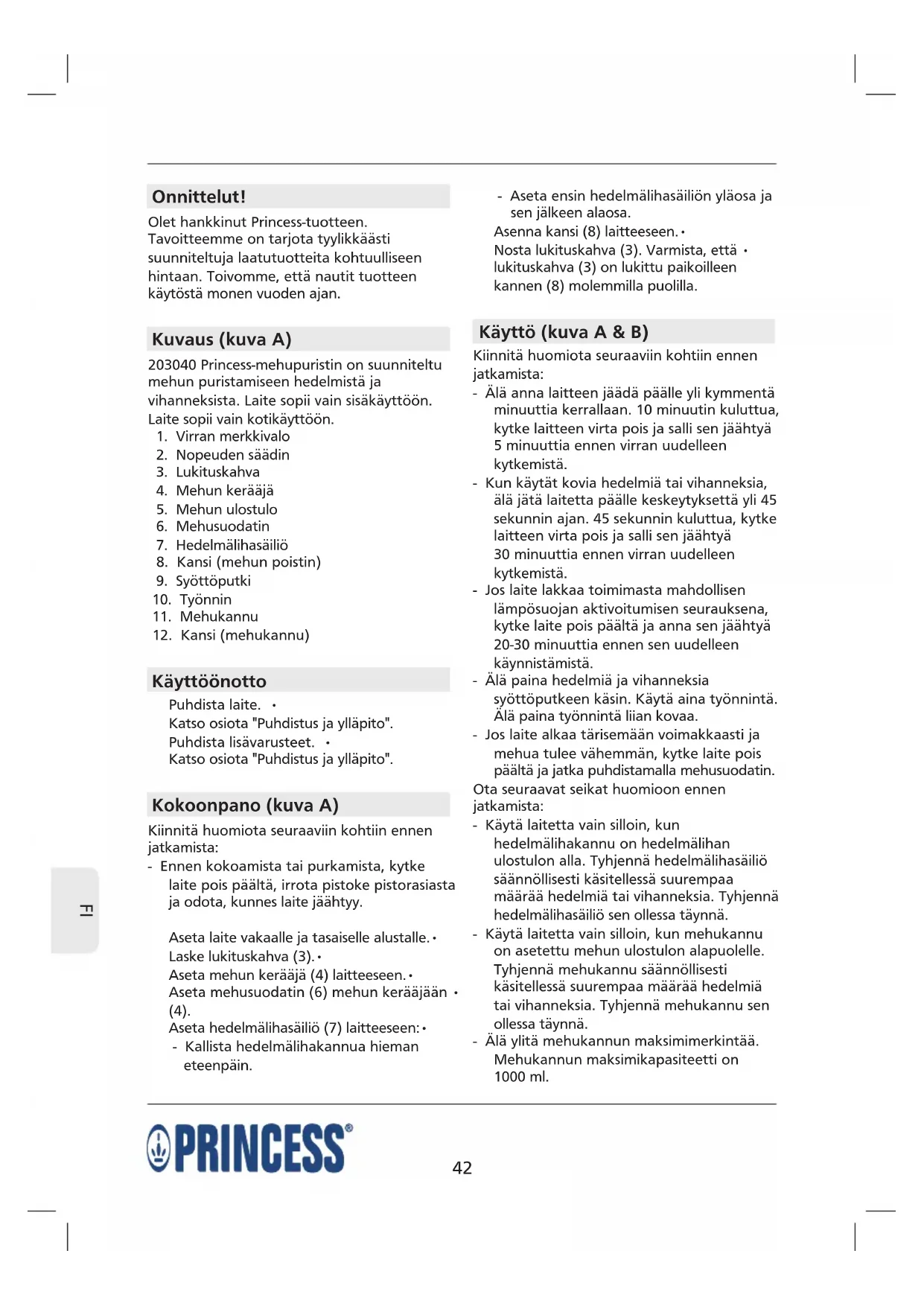 Onnittelut! Olet hankkinut Princess-tuotteen. Tavoitteemme on tarjota tyylikkäästi suunniteltuja laatutuotteita kohtuulliseen hintaan. Toivomme, että nautit tuotteen käytöstä monen vuoden ajan. Kuvaus (kuva A) 203040 Princess-mehupuristin on suunniteltu mehun puristamiseen hedelmistä ja vihanneksista. Laite sopii vain sisäkäyttöön. Laite sopii vain kotikäyttöön.
