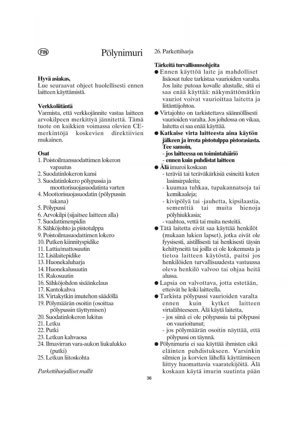 ● Pölynimuria ei saa käyttää ihmisten eikä