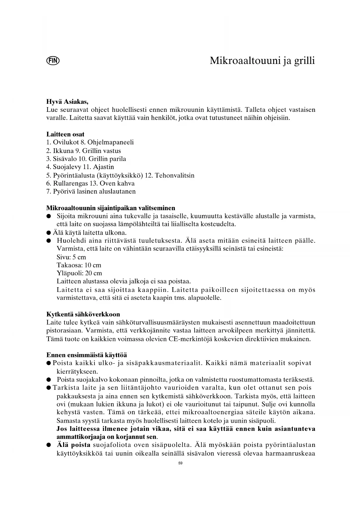 ● Tämä mikroaaltouuni on tarkoitettu vain kotitalouskäyttöön eikä sitä pidä käyttää