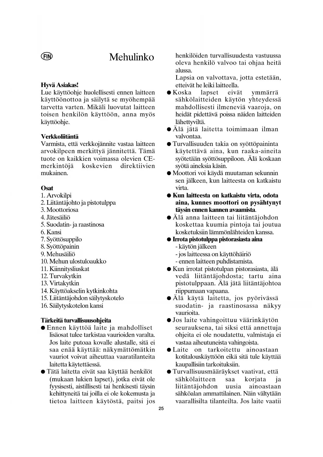 Tärkeitä turvallisuusohjeita ● Ennen käyttöä laite ja mahdolliset lisäosat tulee tarkistaa vaurioiden varalta. Jos laite putoaa kovalle alustalle, sitä ei saa enää käyttää: näkymättömätkin vauriot voivat aiheuttaa vaaratilanteita laitetta käytettäessä. ● Tätä laitetta eivät saa käyttää henkilöt (mukaan lukien lapset), jotka eivät ole fyysisesti, aistillisesti tai henkisesti täysin kehittyneitä tai joilla ei ole kokemusta ja tietoa laitteen käytöstä, paitsi jos henkilöiden turvallisuudesta vastuussa oleva henkilö valvoo tai ohjaa heitä alussa. Lapsia on valvottava, jotta estetään, etteivät he leiki laitteella. ● Koska lapset eivät ymmärrä sähkölaitteiden käytön yhteydessä mahdollisesti ilmeneviä vaaroja, on heidät pidettävä poissa näiden laitteiden lähettyviltä. ● Älä jätä laitetta toimimaan ilman valvontaa. ● Turvallisuuden takia on syöttöpaininta käytettävä aina, kun raaka-aineita syötetään syöttösuppiloon. Älä koskaan syötä aineksia käsin. ● Moottori voi käydä muutaman sekunnin sen jälkeen, kun laitteesta on katkaistu virta. ● Kun laitteesta on katkaistu virta, odota aina, kunnes moottori on pysähtynyt täysin ennen kannen avaamista. ● Älä anna laitteen tai liitäntäjohdon koskettaa kuumia pintoja tai joutua kosketuksiin lämmönlähteiden kanssa. ● Irrota pistotulppa pistorasiasta aina - käytön jälkeen - jos laitteessa on käyttöhäiriö - ennen laitteen puhdistamista. ● Kun irrotat pistotulpan pistorasiasta, älä vedä liitäntäjohdosta; tartu aina pistotulppaan. Älä jätä liitäntäjohtoa riippumaan vapaana. ● Älä käytä laitetta, jos pyörivässä suodatin- ja raastinosassa näkyy vaurioita. ● Jos laite vahingoittuu väärinkäytön seurauksena, tai siksi että annettuja ohjeita ei ole noudatettu, valmistaja ei vastaa aiheutuneista vahingoista. ● Laite on tarkoitettu ainoastaan kotitalouskäyttöön eikä sitä tule käyttää kaupallisiin tarkoituksiin. ● Turvallisuusmääräykset vaativat, että sähkölaitteen saa korjata ja liitäntäjohdon uusia ainoastaan sähköalan ammattilainen. Näin vältytään vaarallisilta tilanteilta. Jos laite vaatii