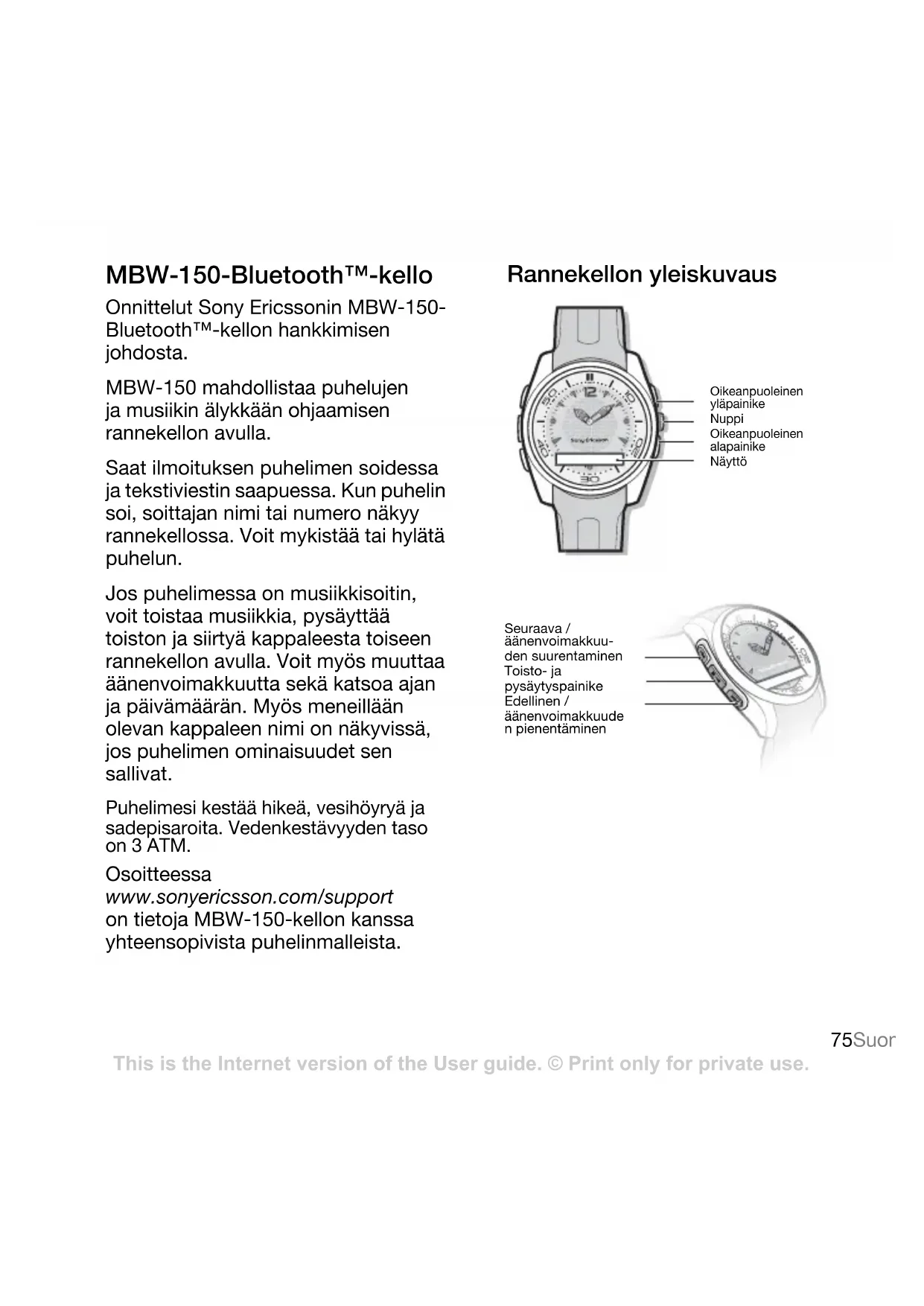 Rannekellon yleiskuvaus Oikeanpuoleinen alapainikeOikeanpuoleinen yläpainikeNuppiNäyttöSeuraava / äänenvoimakkuu-den suurentaminenToisto- ja pysäytyspainikeEdellinen / äänenvoimakkuuden pienentäminen This is the Internet version of the User guide. © Print only for private use.76 Suomi
