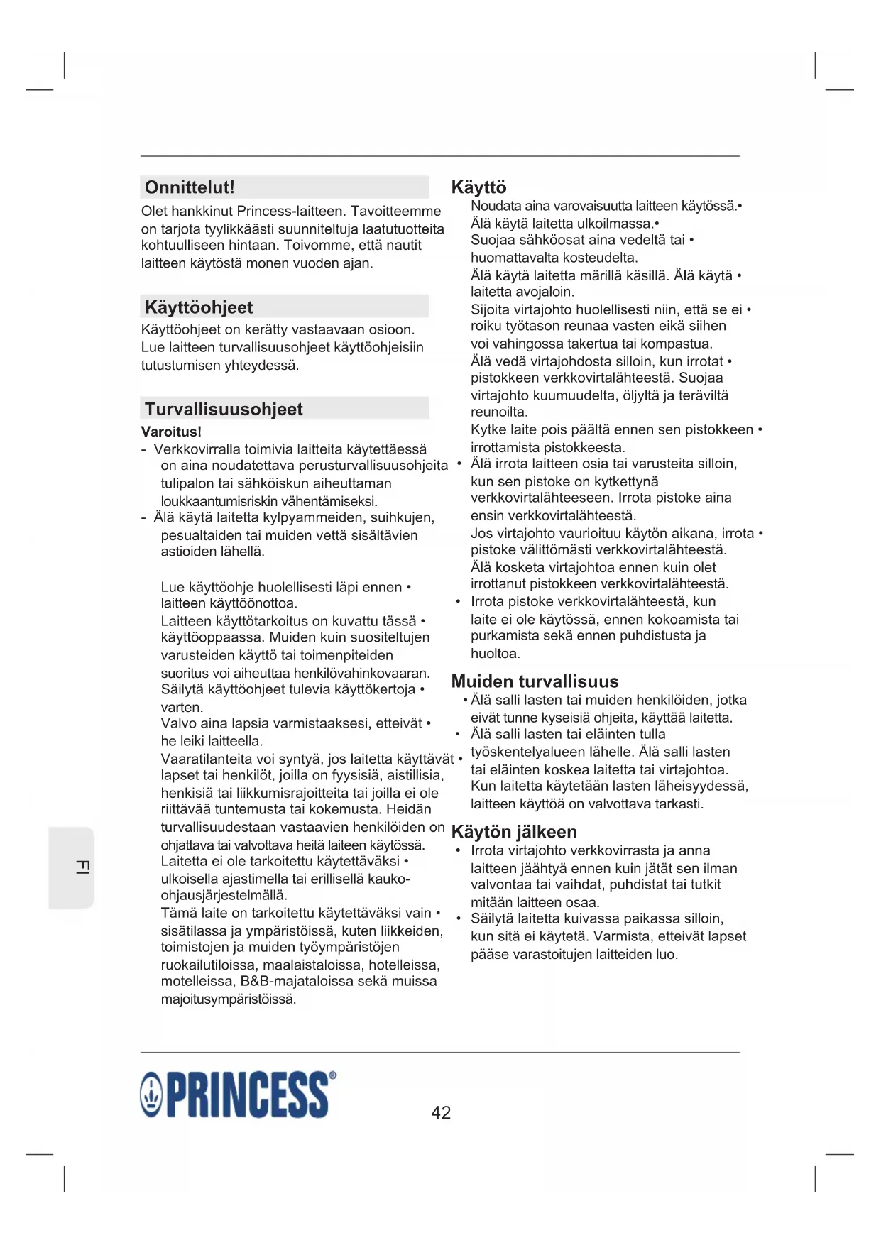Onnittelut! Olet hankkinut Princess-laitteen. Tavoitteemme on tarjota tyylikkäästi suunniteltuja laatutuotteita kohtuulliseen hintaan. Toivomme, että nautit laitteen käytöstä monen vuoden ajan. Käyttöohjeet Käyttöohjeet on kerätty vastaavaan osioon. Lue laitteen turvallisuusohjeet käyttöohjeisiin tutustumisen yhteydessä. Turvallisuusohjeet Varoitus! - Verkkovirralla toimivia laitteita käytettäessä on aina noudatettava perusturvallisuusohjeita tulipalon tai sähköiskun aiheuttaman loukkaantumisriskin vähentämiseksi. - Älä käytä laitetta kylpyammeiden, suihkujen, pesualtaiden tai muiden vettä sisältävien astioiden lähellä. Lue käyttöohje huolellisesti läpi ennen • laitteen käyttöönottoa. Laitteen käyttötarkoitus on kuvattu tässä • käyttöoppaassa. Muiden kuin suositeltujen varusteiden käyttö tai toimenpiteiden suoritus voi aiheuttaa henkilövahinkovaaran. Säilytä käyttöohjeet tulevia käyttökertoja • varten. Valvo aina lapsia varmistaaksesi, etteivät • he leiki laitteella. Vaaratilanteita voi syntyä, jos laitetta käyttävät • lapset tai henkilöt, joilla on fyysisiä, aistillisia, henkisiä tai liikkumisrajoitteita tai joilla ei ole riittävää tuntemusta tai kokemusta. Heidän turvallisuudestaan vastaavien henkilöiden on ohjattava tai valvottava heitä laiteen käytössä. Laitetta ei ole tarkoitettu käytettäväksi • ulkoisella ajastimella tai erillisellä kauko- ohjausjärjestelmällä. Tämä laite on tarkoitettu käytettäväksi vain • sisätilassa ja ympäristöissä, kuten liikkeiden, toimistojen ja muiden työympäristöjen ruokailutiloissa, maalaistaloissa, hotelleissa, motelleissa, B&B-majataloissa sekä muissa majoitusympäristöissä. Käyttö Noudata aina varovaisuutta laitteen käytössä.• Älä käytä laitetta ulkoilmassa.• Suojaa sähköosat aina vedeltä tai • huomattavalta kosteudelta. Älä käytä laitetta märillä käsillä. Älä käytä • laitetta avojaloin. Sijoita virtajohto huolellisesti niin, että se ei • roiku työtason reunaa vasten eikä siihen voi vahingossa takertua tai kompastua. Älä vedä virtajohdosta silloin, kun irrotat • pistokkeen verkkovirtalähteestä. Suojaa virtajohto kuumuudelta, öljyltä ja teräviltä reunoilta. Kytke laite pois päältä ennen sen pistokkeen • irrottamista pistokkeesta. Älä irrota laitteen osia tai varusteita silloin, • kun sen pistoke on kytkettynä verkkovirtalähteeseen. Irrota pistoke aina ensin verkkovirtalähteestä. Jos virtajohto vaurioituu käytön aikana, irrota • pistoke välittömästi verkkovirtalähteestä. Älä kosketa virtajohtoa ennen kuin olet irrottanut pistokkeen verkkovirtalähteestä. Irrota pistoke verkkovirtalähteestä, kun • laite ei ole käytössä, ennen kokoamista tai purkamista sekä ennen puhdistusta ja huoltoa. Muiden turvallisuus Älä salli lasten tai muiden henkilöiden, jotka • eivät tunne kyseisiä ohjeita, käyttää laitetta. Älä salli lasten tai eläinten tulla • työskentelyalueen lähelle. Älä salli lasten tai eläinten koskea laitetta tai virtajohtoa. Kun laitetta käytetään lasten läheisyydessä, laitteen käyttöä on valvottava tarkasti. Käytön jälkeen Irrota virtajohto verkkovirrasta ja anna • laitteen jäähtyä ennen kuin jätät sen ilman valvontaa tai vaihdat, puhdistat tai tutkit mitään laitteen osaa. Säilytä laitetta kuivassa paikassa silloin, • kun sitä ei käytetä. Varmista, etteivät lapset pääse varastoitujen laitteiden luo.43