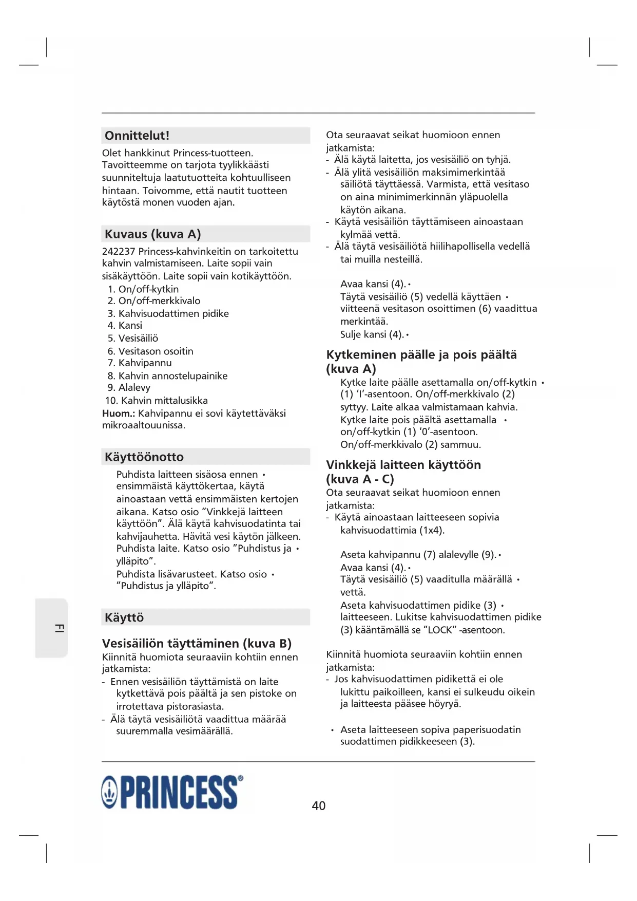 Onnittelut! Olet hankkinut Princess-tuotteen. Tavoitteemme on tarjota tyylikkäästi suunniteltuja laatutuotteita kohtuulliseen hintaan. Toivomme, että nautit tuotteen käytöstä monen vuoden ajan. Kuvaus (kuva A) 242237 Princess-kahvinkeitin on tarkoitettu kahvin valmistamiseen. Laite sopii vain sisäkäyttöön. Laite sopii vain kotikäyttöön.