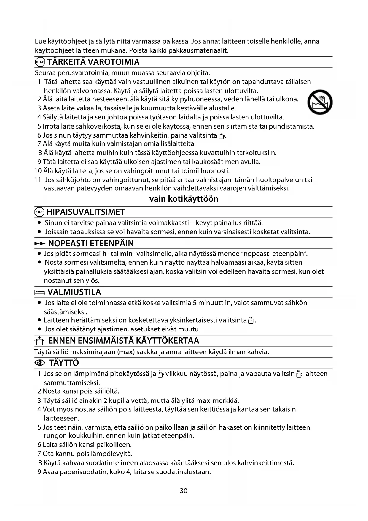 24 Irrota laite sähköverkosta ja anna sen jäähtyä ennen puhdistusta tai säilytykseen laittamista.