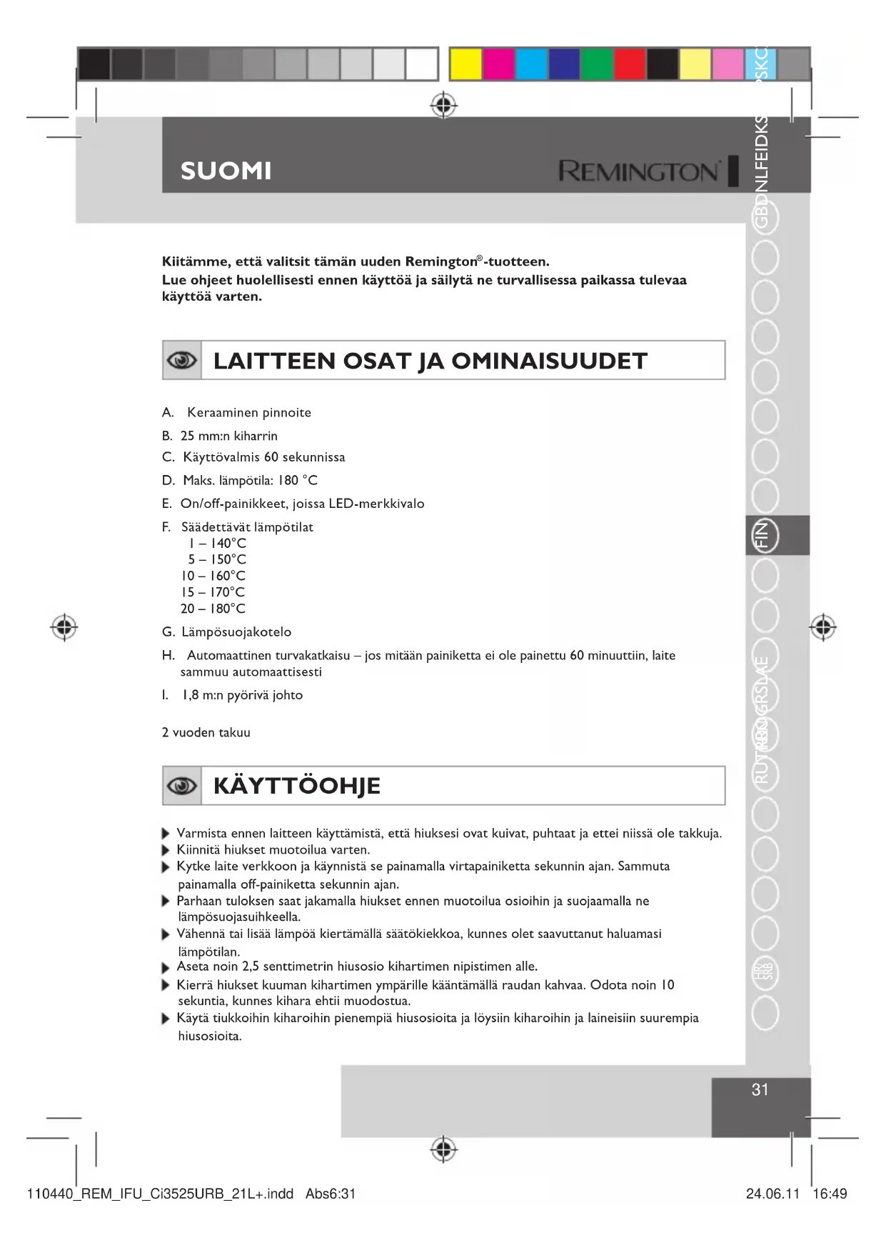 SRB FIN Kiitämme, että valitsit tämän uuden Remington ® -tuotteen.Lue ohjeet huolellisesti ennen käyttöä ja säilytä ne turvallisessa paikassa tulevaa käyttöä varten. LAITTEEN OSAT JA OMINAISUUDET A. Keraaminen pinnoiteB. 25 mm:n kiharrinC. Käyttövalmis 60 sekunnissaD. Maks. lämpötila: 180 °CE. On/off-painikkeet, joissa LED-merkkivalo F. Säädettävät lämpötilat 1 – 140°C 5 – 150°C10 – 160°C15 – 170°C20 – 180°CG. LämpösuojakoteloH. Automaattinen turvakatkaisu – jos mitään painiketta ei ole painettu 60 minuuttiin, laite sammuu automaattisestiI. 1,8 m:n pyörivä johto2 vuoden takuu