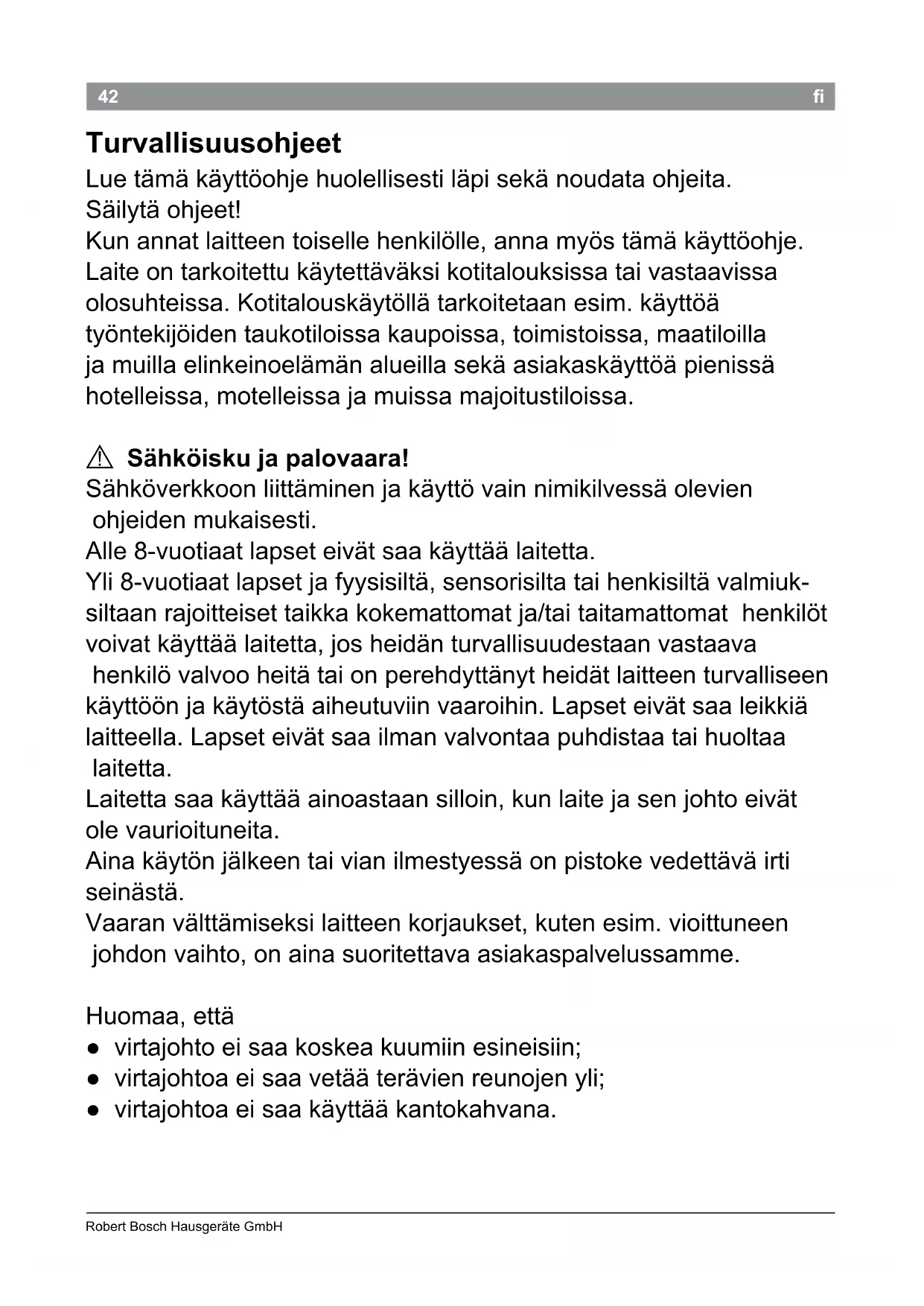 Sähköiskun vaara! Anna laitteen jäähtyä ennen puhdistusta ja irrota pistoke pistorasiasta. Älä koskaan upota laitetta veteen. Älä käytä höyrypesuria. Puhdista laite ulkopuolelta vain pyyhkimällä sitä kostealla pyyhkeellä ja kuivaamalla sitä sen jälkeen. Älä käytä vahvoja tai hankaa- via puhdistusaineita. Säilytys Anna laitteen jäähtyä ennen säilytystä ja irrota pistoke pistorasiasta.46 Robert Bosch Hausgeräte GmbH