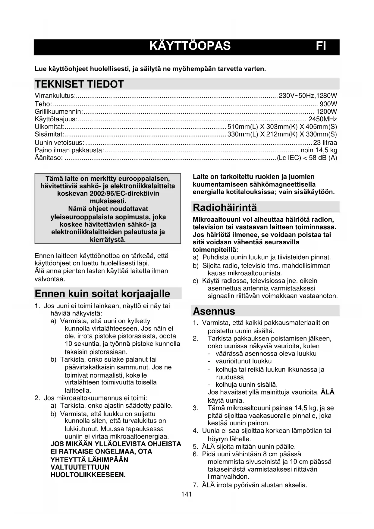 KÄYTTÖOPAS FI Lue käyttöohjeet huolellisesti, ja säilytä ne myöhempään tarvetta varten.