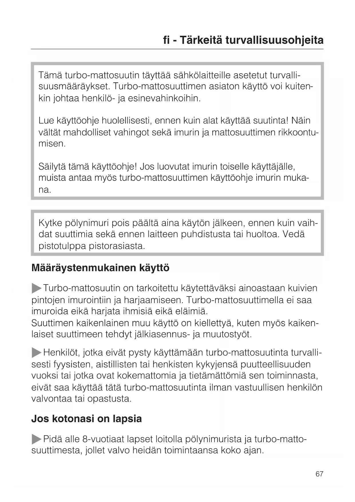 eivät saa käyttää tätä turbo-mattosuutinta ilman vastuullisen henkilön