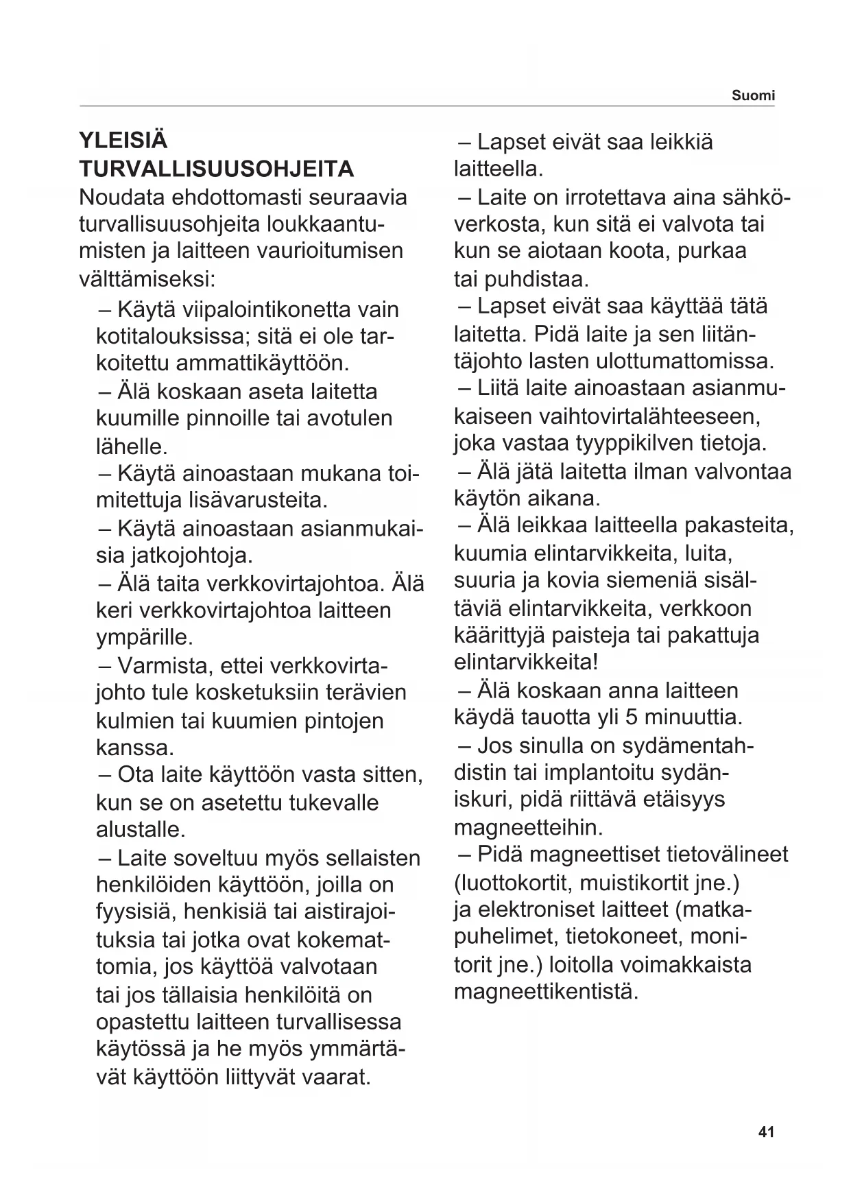 Símbolo Explicación Marcado CE: Este producto es conforme con los requisitos actuales de la unión Europea. Este producto se ha comercializado después del 13 de agosto de 2005. No se puede desechar con la basura doméstica. El símbolo del contenedor de basura tachado indica la necesidad de una recogida selectiva. Apto para el contacto con alimentos Dispositivo con clase de protección II41 Suomi YLEISIÄ TURVALLISUUSOHJEITA Noudata ehdottomasti seuraavia turvallisuusohjeita loukkaantu- misten ja laitteen vaurioitumisen välttämiseksi: – Käytä viipalointikonetta vain kotitalouksissa; sitä ei ole tar- koitettu ammattikäyttöön. – Älä koskaan aseta laitetta kuumille pinnoille tai avotulen lähelle. – Käytä ainoastaan mukana toi- mitettuja lisävarusteita. – Käytä ainoastaan asianmukai- sia jatkojohtoja. – Älä taita verkkovirtajohtoa. Älä keri verkkovirtajohtoa laitteen ympärille. – Varmista, ettei verkkovirta- johto tule kosketuksiin terävien kulmien tai kuumien pintojen kanssa. – Ota laite käyttöön vasta sitten, kun se on asetettu tukevalle alustalle. – Laite soveltuu myös sellaisten henkilöiden käyttöön, joilla on fyysisiä, henkisiä tai aistirajoi- tuksia tai jotka ovat kokemat- tomia, jos käyttöä valvotaan tai jos tällaisia henkilöitä on opastettu laitteen turvallisessa käytössä ja he myös ymmärtä- vät käyttöön liittyvät vaarat. – Lapset eivät saa leikkiä laitteella. – Laite on irrotettava aina sähkö- verkosta, kun sitä ei valvota tai kun se aiotaan koota, purkaa tai puhdistaa. – Lapset eivät saa käyttää tätä laitetta. Pidä laite ja sen liitän- täjohto lasten ulottumattomissa. – Liitä laite ainoastaan asianmu- kaiseen vaihtovirtalähteeseen, joka vastaa tyyppikilven tietoja. – Älä jätä laitetta ilman valvontaa käytön aikana. – Älä leikkaa laitteella pakasteita, kuumia elintarvikkeita, luita, suuria ja kovia siemeniä sisäl- täviä elintarvikkeita, verkkoon käärittyjä paisteja tai pakattuja elintarvikkeita! – Älä koskaan anna laitteen käydä tauotta yli 5 minuuttia. – Jos sinulla on sydämentah- distin tai implantoitu sydän- iskuri, pidä riittävä etäisyys magneetteihin. – Pidä magneettiset tietovälineet (luottokortit, muistikortit jne.) ja elektroniset laitteet (matka- puhelimet, tietokoneet, moni- torit jne.) loitolla voimakkaista magneettikentistä.42 Sähköiskun vaara – Irrota verkkovirtapistoke aina pistorasiasta, jos ilmenee toimintahäiriö, ja myös aina ennen puhdistusta tai kun lai- tetta ei käytetä. Irrota vetämällä suoraan pistokkeesta; älä vedä johdosta. – Älä koskaan upota laitetta veteen. Älä koskaan altista laitetta sateelle tai muulle kosteudelle. Jos laite putoaa veteen, irrota pistoke pistorasi- asta, ennen kuin nostat laitteen vedestä. Anna valtuutetun huoltopisteen tarkastaa laite, ennen kuin otat sen uudelleen käyttöön. – Älä käytä laitetta kostein käsin. Älä käytä laitetta, jos se on märkä tai kostea tai jos seisot kostealla lattialla. Älä käytä laitetta ulkotiloissa. – Jos havaitset vaurioita laitteen osissa, lopeta käyttö välittö- mästi ja ota yhteyttä ritter- yhtiön asiakaspalveluun. – Jos verkkovirtajohto vaurioituu, valmistajan tai valmistajan asia- kaspalvelun tai vastaavan päte- vän henkilön on vaihdettava se, jotta vältetään vaaratilanteet. Loukkaantumisvaara – Tätä laitetta ei saa käyttää ilman leikkuukelkkaa tai leik- kuutukea, ellei leikattava tuote ole kooltaan ja muodoltaan sellainen, ettei niiden käyttö ole mahdollista. – Ennen kuin vaihdat lisävarus- teita tai lisäosia, jotka liikkuvat käytön aikana, laite on kytket- tävä pois päältä ja irrotettava sähköverkosta. – Pyöröterä on erittäin terävä. – Älä missään tapauksessa koske pyöröterään laitteen käy- tön aikana! – Ennen kuin puhdistat laitetta, kytke se pois päältä, irrota pistoke pistorasiasta ja käännä leikkauspaksuuden säädin nolla-asentoon. – Pyöröterä jatkaa pyörimistä jonkin aikaa sammutuksen jälkeen. Suomi43 Suomi Taita etu- ja takaliepeen kuvat esiin. Lue käyttöohje huolellisesti läpi ennen laitteen käyttöönottoa. Säilytä käyttöohje ja luovuta se aina laitteen mukana. Ajantasainen käyttöohje on saa- tavana myös osoitteesta www.ritterwerk.de.