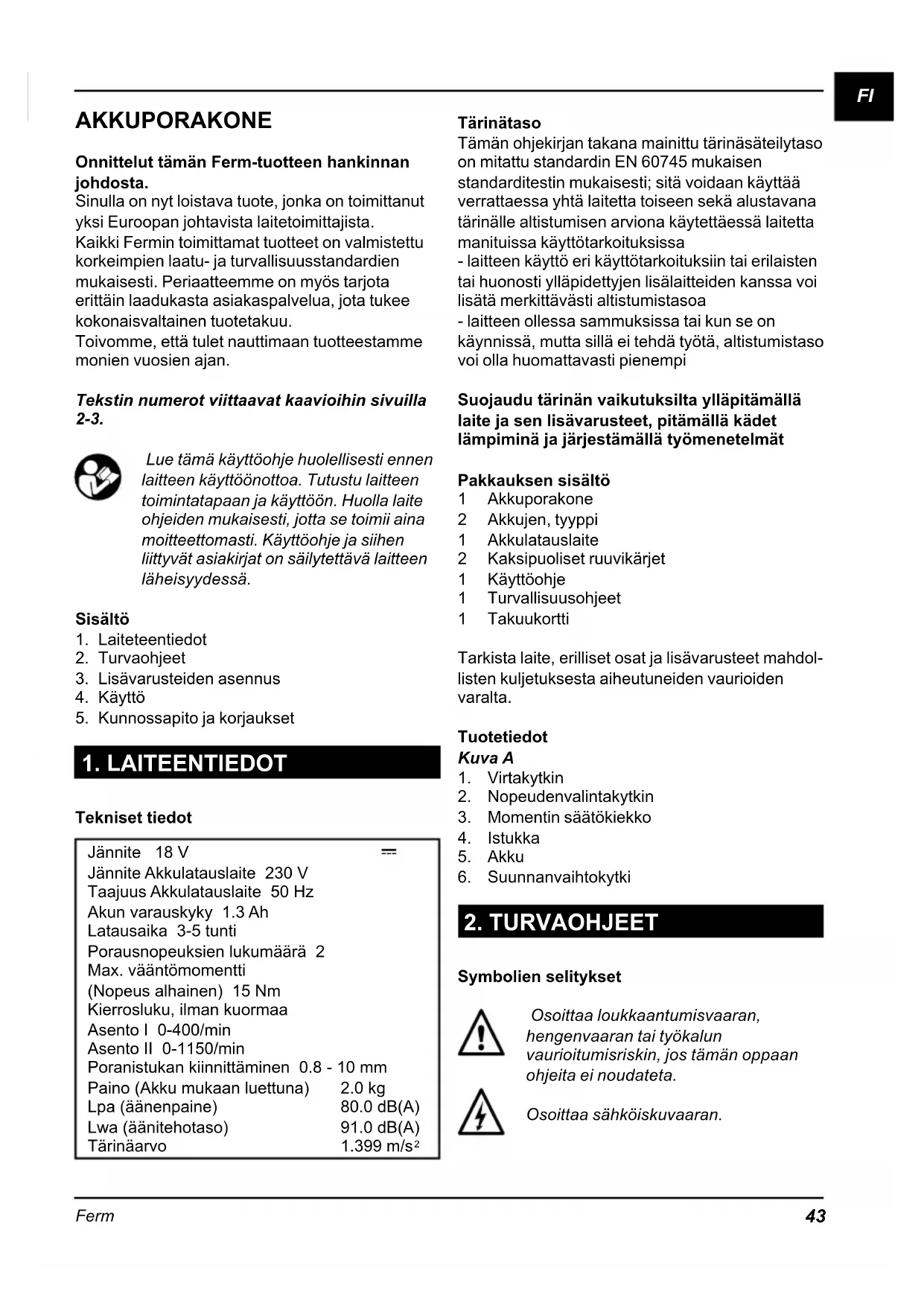 Ferm AKKUPORAKONE Onnittelut tämän Ferm-tuotteen hankinnan johdosta. Sinulla on nyt loistava tuote, jonka on toimittanut yksi Euroopan johtavista laitetoimittajista. Kaikki Fermin toimittamat tuotteet on valmistettu korkeimpien laatu- ja turvallisuusstandardien mukaisesti. Periaatteemme on myös tarjota erittäin laadukasta asiakaspalvelua, jota tukee kokonaisvaltainen tuotetakuu. Toivomme, että tulet nauttimaan tuotteestamme monien vuosien ajan. Tekstin numerot viittaavat kaavioihin sivuilla 2-3. Lue tämä käyttöohje huolellisesti ennen laitteen käyttöönottoa. Tutustu laitteen toimintatapaan ja käyttöön. Huolla laite ohjeiden mukaisesti, jotta se toimii aina moitteettomasti. Käyttöohje ja siihen liittyvät asiakirjat on säilytettävä laitteen läheisyydessä. Sisältö