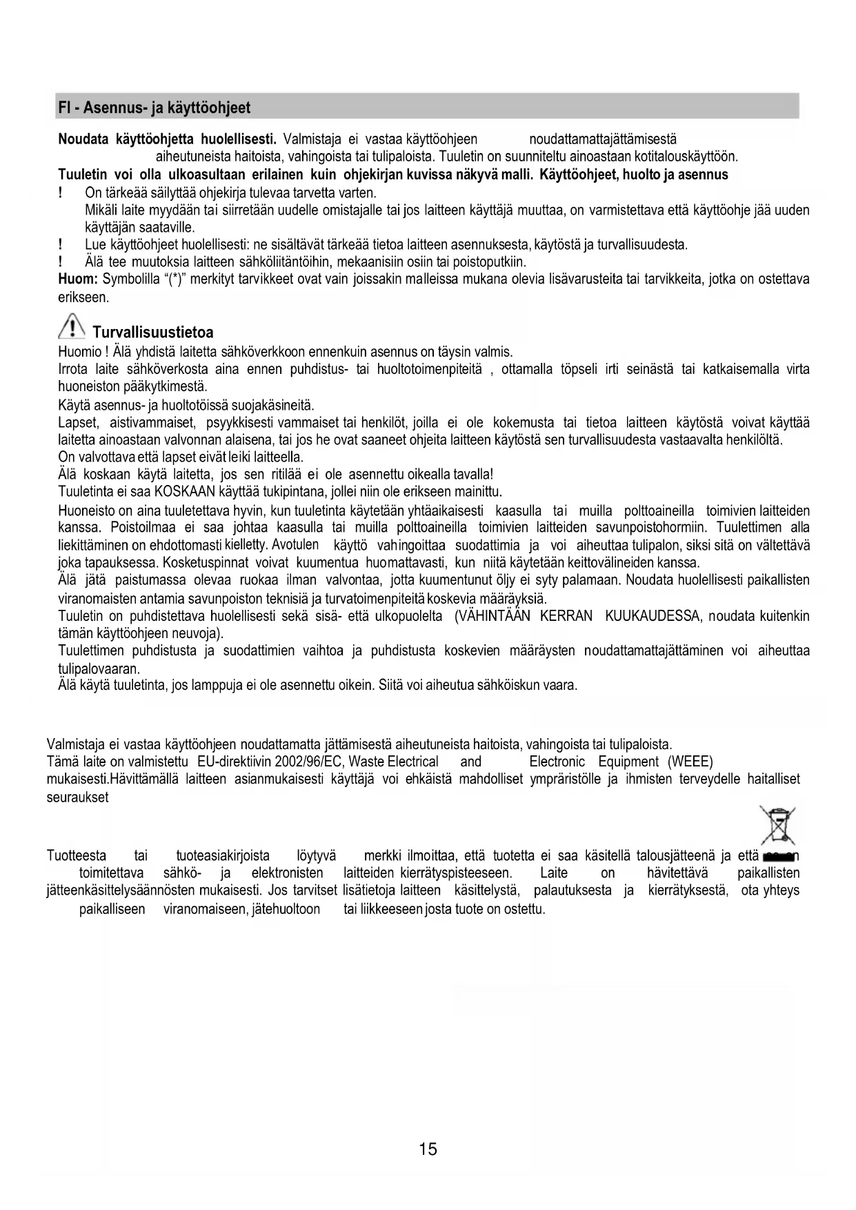 Älä koskaan käytä laitetta, jos sen ritilää ei ole asennettu oikealla tavalla! Tuuletinta ei saa KOSKAAN käyttää tukipintana, jollei niin ole erikseen mainittu. Huoneisto on aina tuuletettava hyvin, kun tuuletinta käytetään yhtäaikaisesti kaasulla tai muilla polttoaineilla toimivien laitteiden