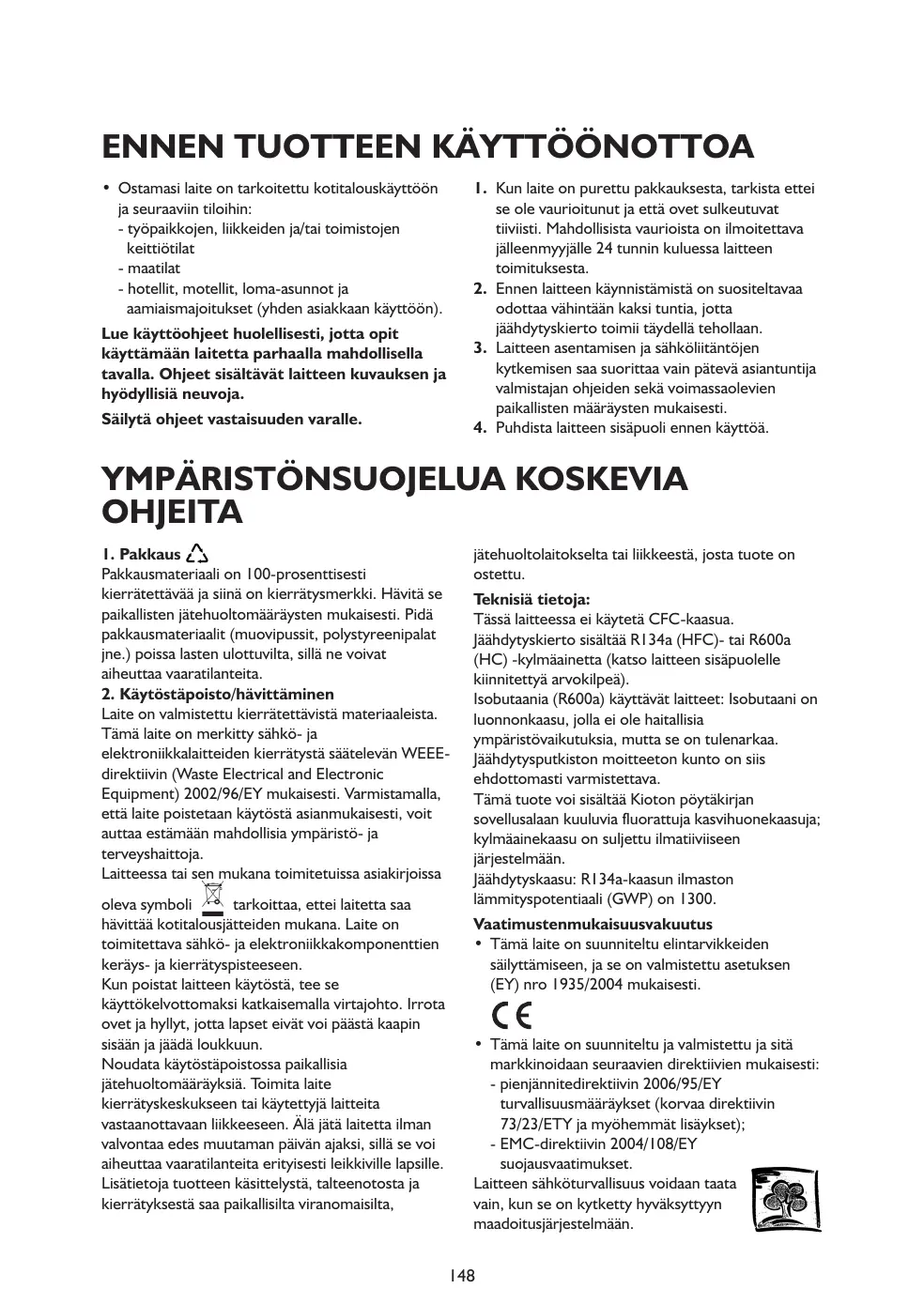 Informations : Cet appareil est sans CFC. Le circuit réfrigérant contient du R134a (HFC) ou du R600a (HC). Pour en savoir plus, consultez la plaquette signalétique située à l'intérieur de l'appareil. Pour les appareils à isobutane (R600a) : l'isobutane est un gaz naturel sans danger pour l'environnement, mais inflammable. Assurez-vous par conséquent que les tuyaux du circuit réfrigérant sont en parfait état. Ce produit peut contenir des gaz à effet de serre fluorés visés par le protocole de Kyoto ; le gaz réfrigérant est contenu à l'intérieur d'un circuit hermétique. Gaz réfrigérant : le R134a a un potentiel de réchauffement global (GWP) de 1300. Déclaration de conformité • Cet appareil est destiné à la conservation de produits alimentaires et est fabriqué conformément à la réglementation CE N° 1935/2004.