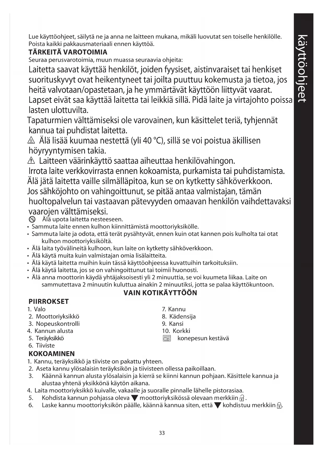 • Älä anna moottorin käydä yhtäjaksoisesti yli 2 minuuttia, se voi kuumeta liikaa. Laite on