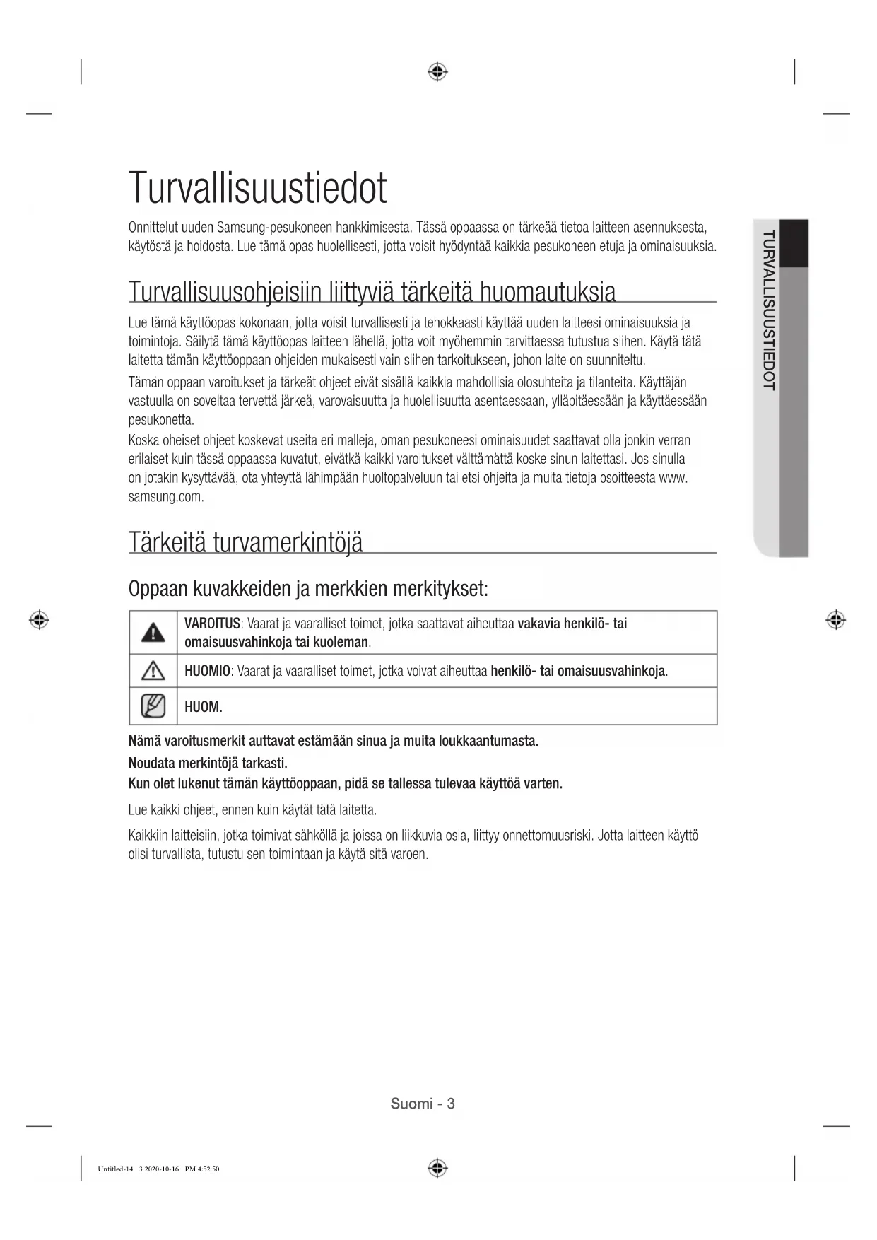 Onnittelut uuden Samsung-pesukoneen hankkimisesta. Tassa oppaassa on tärkeä tietaa laiteen asennuksesta, kaytostä ja hoidosta. Lue tamä opas huolellisesti, jotta voisit hyödyntäa kaikkia pesukoneen etuja ja ominaisuksia.
