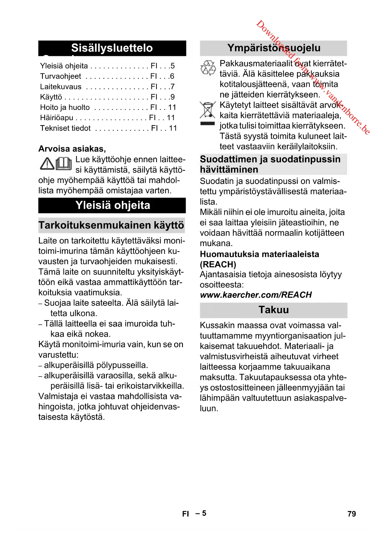 För att suga upp fukt eller väta, se till att använda rätt insats i golvmun- stycket och anslut lämplig tillbehör. 몇 Observera: Stäng omedelbart av maskinen och dra ur el-kontakten om skum bildas eller vätska tränger ut! Använd ingen filterpåse! Observera: Om behållaren är full stängs sugöppningen av en flottör och sugturbinen går med högre varvtal. Koppla omedelbart från apparaten och töm behållaren. Bild Anpassa vid behov adaptern till an- slutningsdiametern på elverktyget med hjälp av en kniv. Sätt adaptern på sugslangens handtag och anslut den till elverkty- gets anslutning. Förbind elverktygets nätkontakt med sugen. Bild Ställ sugaren till position II och på- börja arbetet. Observera: Så snart som elverktyget slås på, startar sugturbinen efter 0,5 sekunders fördröjning. När elverktyget stängs av, löper sugturbinen ytterligare ca 5 sekunder, för att suga upp reste- rande smuts i sugslangen. Rengöring av svåråtkomliga ställen el- ler på platser där uppsugning inte kan utföras, t.ex. löv i en grusbädd. Bild Stick in sugslangen i blåsanslut- ningen, därmed är utblåsningsfunk- tionen aktiverad. Stäng av aggregatet. Bild Häng i golvmunstycket i förvarings- hållaren. Stäng av apparaten och dra ur nät- anslutningen. Bild Ta av maskinhuvudet och töm be- hållaren. Bild Förvara nätkabel och tillbehör på aggregatet. Förvara aggregatet torrt. Fara Stäng av aggregatet och dra ut nätkontaken innan vård och skötselarbeten ska utföras. Reparationsarbeten och arbe- ten på elektriska komponenter får endast utföras av auktorise- rad kundservice. 몇 Varning Använd inte skurmedel, glas- el- ler allrengöringsmedel! Doppa aldrig ner apparaten i vatten. Vårda apparaten och tillbehören med ett vanligt i handeln förekom- mande plastrengöringsmedel. Spola vid behov ur behållare och tillbehör med vatten och torka före nästa användningstillfälle. Bild Rengör patronfiltret vid behov en- dast under rinnande vatten, skrub- Våtsugning Arbeta med elverktyg Blåsfunktion Avbryta drift Avsluta driften Töm behållaren Förvaring av apparaten Skötsel och underhåll 77SV Downloaded from www.vandenborre.be– 11 ba eller borsta inte av det. Låt det torka helt innan det sätts tillbaka. Om sugeffekten hos aggregatet för- sämras så kontrollera följande punkter. Tillbehör, sugslang eller sugrör är igensatta. Tag bort smutsen med ett skaft. Bild Filterpåsen är full, sätt i en ny filter- påse. Bild Patronfiltret är smutsigt, slå ur smutsen och rengör vid behov un- der rinnande vatten. Byte skadat patronfilter. Tekniska data finns på sidan IV. Nedan följer en förklaring av de symboler som används där. Med reservation för tekniska ändringar! Åtgärder vid störningar Avtagande sugeffekt Tekniska data Spänning Effekt P nominell Max. anslutningseffekt i ma- skinuttaget Nätsäkring (trög) Behållarvolym Vattenupptagning med hand- tag Vattenupptagning med golv- munstycke Nätkabel Ljudtrycksnivå (EN 60704-2-1) Vikt (utan tillbehör) 78 SV Downloaded from www.vandenborre.beSuomi – 5 Arvoisa asiakas, Lue käyttöohje ennen laittee- si käyttämistä, säilytä käyttö- ohje myöhempää käyttöä tai mahdol- lista myöhempää omistajaa varten. Laite on tarkoitettu käytettäväksi moni- toimi-imurina tämän käyttöohjeen ku- vausten ja turvaohjeiden mukaisesti. Tämä laite on suunniteltu yksityiskäyt- töön eikä vastaa ammattikäyttöön tar- koituksia vaatimuksia. – Suojaa laite sateelta. Älä säilytä lai- tetta ulkona. – Tällä laitteella ei saa imuroida tuh- kaa eikä nokea. Käytä monitoimi-imuria vain, kun se on varustettu: – alkuperäisillä pölypusseilla.– alkuperäisillä varaosilla, sekä alku- peräisillä lisä- tai erikoistarvikkeilla. Valmistaja ei vastaa mahdollisista va- hingoista, jotka johtuvat ohjeidenvas- taisesta käytöstä. Pakkausmateriaalit ovat kierrätet- täviä. Älä käsittelee pakkauksia kotitalousjätteenä, vaan toimita ne jätteiden kierrätykseen. Käytetyt laitteet sisältävät arvok- kaita kierrätettäviä materiaaleja, jotka tulisi toimittaa kierrätykseen. Tästä syystä toimita kuluneet lait- teet vastaaviin keräilylaitoksiin. Suodatin ja suodatinpussi on valmis- tettu ympäristöystävällisestä materiaa- lista. Mikäli niihin ei ole imuroitu aineita, joita ei saa laittaa yleisiin jäteastioihin, ne voidaan hävittää normaalin kotijätteen mukana. Huomautuksia materiaaleista (REACH) Ajantasaisia tietoja ainesosista löytyy osoitteesta: www.kaercher.com/REACH Kussakin maassa ovat voimassa val- tuuttamamme myyntiorganisaation jul- kaisemat takuuehdot. Materiaali- ja valmistusvirheistä aiheutuvat virheet laitteessa korjaamme takuuaikana maksutta. Takuutapauksessa ota yhte- ys ostostositteineen jälleenmyyjään tai lähimpään valtuutettuun asiakaspalve- luun. Sisällysluettelo Yleisiä ohjeita . . . . . . . . . . . . . . FI . . .5Turvaohjeet . . . . . . . . . . . . . . . FI . . .6Laitekuvaus . . . . . . . . . . . . . . . FI . . .7Käyttö . . . . . . . . . . . . . . . . . . . . FI . . .9Hoito ja huolto . . . . . . . . . . . . . FI . . 11Häiriöapu . . . . . . . . . . . . . . . . . FI . . 11Tekniset tiedot . . . . . . . . . . . . . FI . . 11 Yleisiä ohjeita Tarkoituksenmukainen käyttö Ympäristönsuojelu Suodattimen ja suodatinpussin hävittäminen Takuu 79FI Downloaded from www.vandenborre.be– 6 KÄRCHER -edustustomme vastaa mielellään kysymyksiisi ja auttaa mah- dollisissa häiriötilanteissa. Tärkeimpien osien varaosaluettelo löy- tyy tämän käyttöohjeen lopusta. Varaosat ja erityisvarusteet saat kaup- piaaltasi tai lähimmältä KÄRCHER ty- täryhtiöltä. – Laitetta eivät saa käyttää sel- laiset henkilöt, joilla on rajoit- tuneet fyysiset, aistimukselli- set tai henkiset kyvyt tai, joilta puuttuu laitteen käyttämiseen tarvittavaa kokemusta ja/tai tietoa, paitsi jos heidän turval- lisuudestaan vastaava henki- lö valvoo 