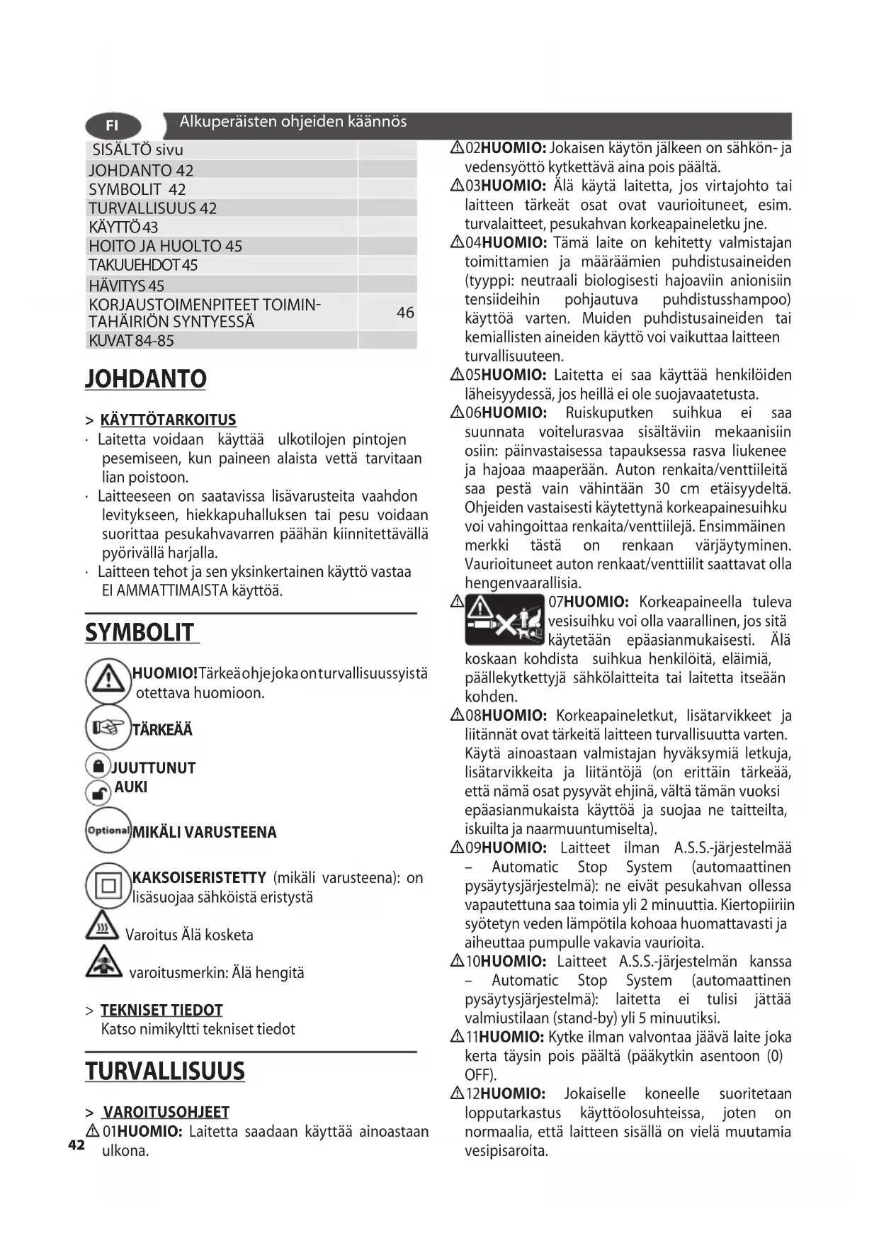 - Pidä laitteet ja tarvikkeet kuivassa, turvallisessa paikassa poissa lasten ulottuvilta TAKUUEHDOT Kaikki valmistamamme laitteet on testattu huolelli- sesti ja niille annetaan takuu valmistusvikoja vastaan voimassa olevan lain mukaan. Takuu on voimassa ostopäivästä alkaen. Takuu ei koske: - liikkuvia, kuluvia osia - kumi osat, hii- liharjat kivihiili, suodattimet, ja lisävarusteet, ja optio- nal lisävarusteet. - Satunnaisia vaurioita ja vaurioita, jotka ovat aiheutuneet kuljetuksessa, huolimattomu- udesta tai väärästä käsittelystä, väärästä ja tarkoitu- ksen vastaisesta käytöstä ja asennuksesta, - Takuu ei sisällä toimivien osien mahdollisesti tarpeellista puhdistusta, suodattimet tukkiutunee, tukkiutuneet suuttimet, kalkin muodostumisen vuoksi lukittuneet laitteet, Laite on tarkoitettu kotikäyttöön EI AMMATTIKÄYT- TÖÖN. takuu ei kata mitään muuta käyttöä. HÄVITYS Laki (EU:n direktiivin 2002/96/CE 27. tammikuuta 2003 mukaan) kieltää sähköisen tai elektronisen lait- teen omistajaa, tämän tuotteen tai sen sähköisten- tai elektronisten laitteiden hävittä misen kotitalouksien kiinteinä yhdyskuntajätteinä ja kehoittaa sen sijaan niiden hävittämistä niille tarkoitetuissa keruukesku- ksissa. Valmistaja voi hävittää suoraan hävitettävän tuotteen jos hankittava uusi tuote on samanarvoinen hävitettävän tuotteen kanssa.FI