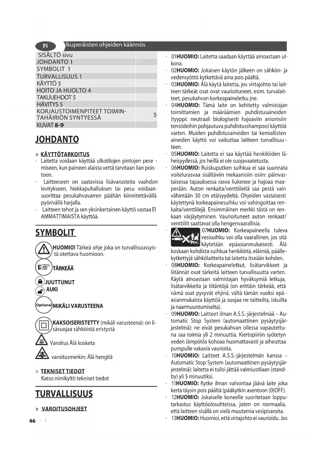 KAKSOISERISTETTY (mikäli varusteena): on li- säsuojaa sähköistä eristystä Varoitus Älä kosketa varoitusmerkin: Älä hengitä > TEKNISET TIEDOT Katso nimikyltti tekniset tiedot TURVALLISUUS > VAROITUSOHJEET