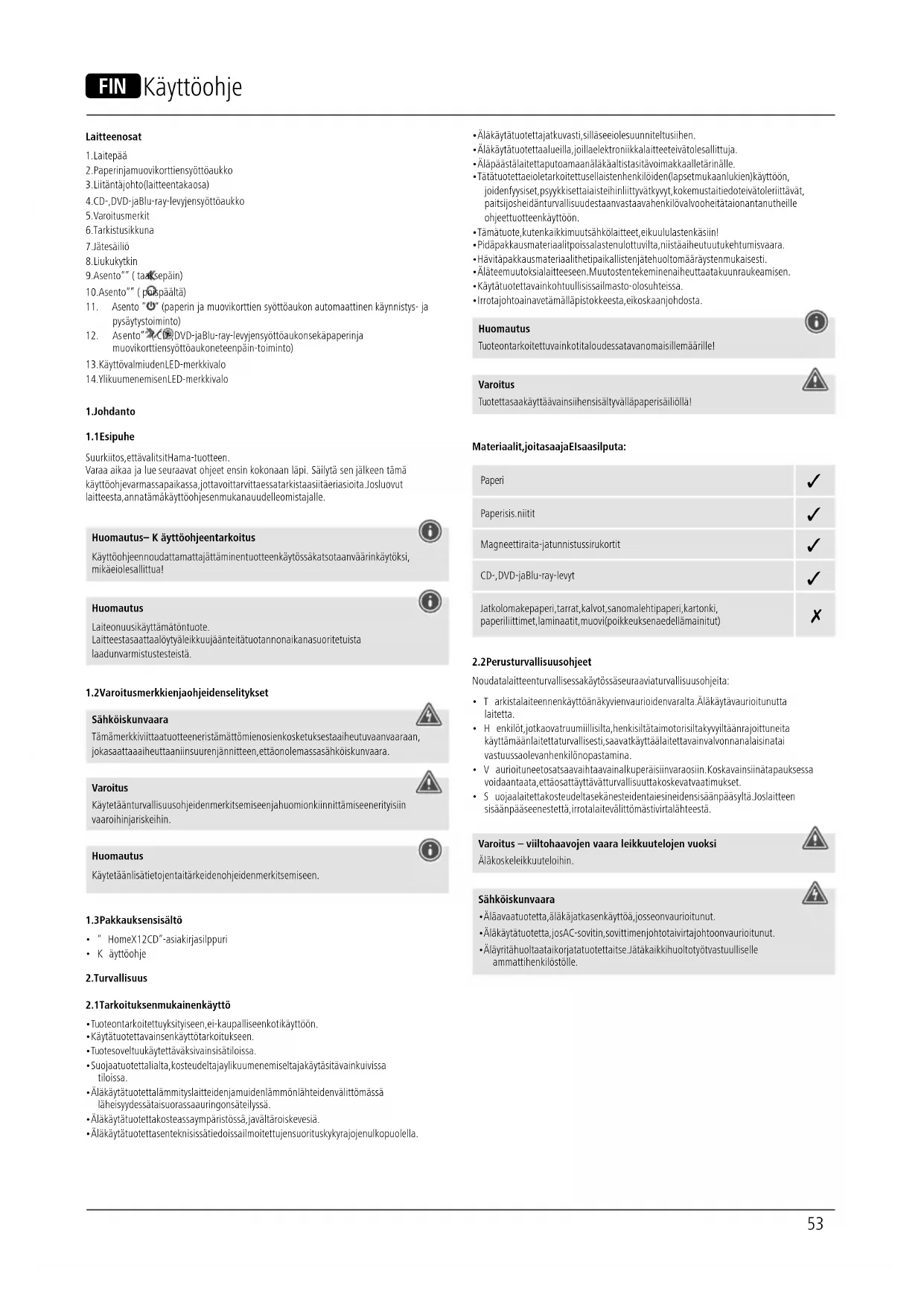 Noudata varoitusmerkkejä, jotta vältät loukkaantumiset tai laitteen vaurioitumisen.
