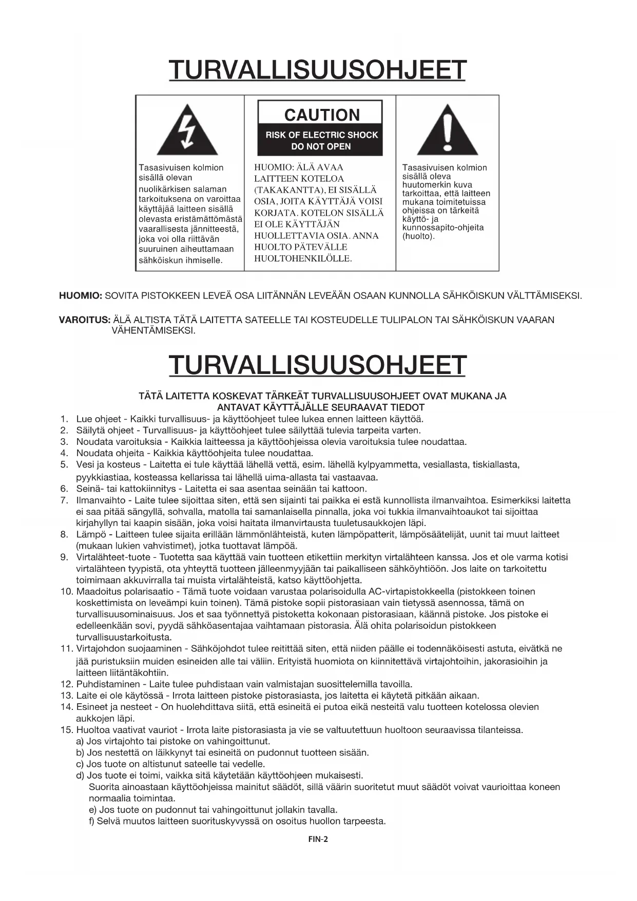 HUOLTOHENKILÖLLE. Tasasivuisen kolmion sisällä olevan nuolikärkisen salaman tarkoituksena on varoittaa käyttäjää laitteen sisällä olevasta eristämättömästä vaarallisesta jännitteestä, joka voi olla riittävän suuruinen aiheuttamaan sähköiskun ihmiselle.Tasasivuisen kolmion sisällä oleva huutomerkin kuva tarkoittaa, että laitteen mukana toimitetuissa ohjeissa on tärkeitä käyttö- ja kunnossapito-ohjeita (huolto). CAUTION