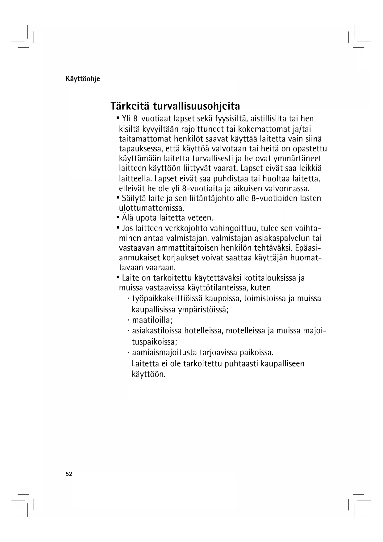 - Laite on tarkoitettu käytettäväksi kotitalouksissa ja muissa vastaavissa käyttötilanteissa, kuten ⋅ työpaikkakeittiöissä kaupoissa, toimistoissa ja muissa kaupallisissa ympäristöissä; ⋅ maatiloilla; ⋅ asiakastiloissa hotelleissa, motelleissa ja muissa majoi- tuspaikoissa; ⋅ aamiaismajoitusta tarjoavissa paikoissa. Laitetta ei ole tarkoitettu puhtaasti kaupalliseen käyttöön. Käyttöohje53