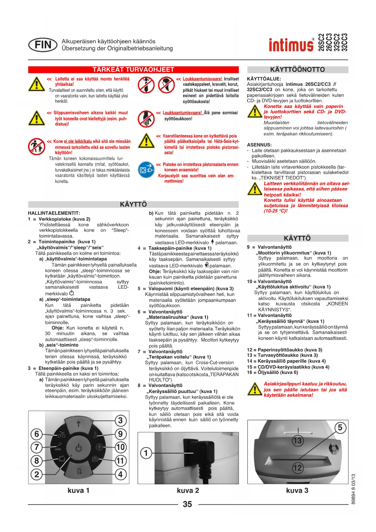 - Beräknat för A4-papper 70g/m vid 230V/50Hz -10% STÖRNING Nätanslutningsdata anslutningsspänning/frekvens · strömförbrukning · effekt intimus 26SC2 220-240V/50Hz · 1,7 A · 0,39 kW 120V/60Hz · 2,9 A · 0,35 kW intimus 26CC3 220-240V/50Hz · 1,7 A · 0,39 kW 120V/60Hz · 2,9 A · 0,35 kW intimus 32SC2 220-240V/50Hz · 1,9 A · 0,44 kW 120V/60Hz · 3,5 A · 0,42 kW intimus 32CC3 220-240V/50Hz · 1,9 A · 0,44 kW 120V/60Hz · 3,5 A · 0,42 kW Intermittent drift Papper / CD,DVD Papper / CD,DVD PÅ / AV B x D x H intimus 26SC2 276-4S 4 mm / 8 mm 13 ark* / 1 styck 240 mm ca. 55 dB(A) 10 / 45 min 390 x 330 x 550 mm 16 kg intimus 26CC3 276-4C 4x28 mm / 8 mm 9 ark* / 1 styck 240 mm ca. 55 dB(A) 10 / 45 min 390 x 330 x 550 mm 16,2 kg intimus 32SC2 277-4S 4 mm / 8 mm 17 ark* / 1 styck 240 mm ca. 55 dB(A) 10 / 45 min 390 x 360 x 600 mm 16,5 kg intimus 32CC3 277-4C 4x28 mm / 8 mm 12 ark* / 1 styck 240 mm ca. 55 dB(A) 10 / 45 min 390 x 360 x 600 mm 16,7 kg TEKNISKA DATA SPECIALTILLBEHÖR Benämning Plastpåse, 300x300x700x0,018 mm 99925Oljekanna, 110 ml 88035 Kontakta återförsäljaren för efterbeställning av specialtillbehör och reservdelar. Översättning av originaldriftsanvisningarna Übersetzung der Originalbetriebsanleitung Säkring (trög): 220-240V = 10 A / 120V = 15 A << Loukkaantumisvaara! Irralliset vaatekappaleet, kravatit, korut, pitkät hiukset tai muut irralliset esineet on pidettävä loitolla syöttöaukosta!<< Loukkaantumisvaara! Älä pane sormiasi syöttöaukkoon!<< Vaaratilanteessa kone on kytkettävä pois päältä pääkatkaisijalla tai Hätä-Seis-kyt-kimellä tai irrotettava pistoke pistorasi-asta!<< Pistoke on irrotettava pistorasiasta ennen koneen avaamista! Korjaustyöt saa suorittaa vain alan am-mattimies! << Laitetta ei saa käyttää monta henkilöä yhtäaikaa! Turvalaitteet on suunniteltu siten, että käyttö on vaaratonta vain, kun laitetta käyttää yksi henkilö.<< Silppuamisvaiheen aikana kaikki muut -distus)!<< Kone ei ole leikkikalu eikä sitä ole missään nimessä tarkoitettu eikä se sovellu lasten käyttöön! Tämän koneen kokonaissuunnittelu tur-vatekniseltä kannalta (mitat, syöttöaukot, turvakatkaisimet jne.) ei takaa minkäänlaista vaaratonta käsittelyä lasten käyttäessä konetta.Asiakirjantuhooja intimus 26SC2/CC3 // 32SC2/CC3 on kone, joka on tarkoitettu paperiasiakirjojen sekä tietovälineiden kuten CD- ja DVD-levyjen ja luottokorttien.Konetta saa käyttää vain paperin ja luottokorttien sekä CD- ja DVD-levyjen!Muunlaisten tietovälineiden silppuaminen voi johtaa laitevaurioihin ( esim. teräpakan rikkoutumiseen).- Laite otetaan pakkauksestaan ja asennetaan paikoilleen.- Muovisäkki asetetaan säiliöön.- Liitetään laite virtaverkkoon pistokkeella (tar-kistettava tarvittavat pistorasian sulaketiedot ks. „TEKNISET TIEDOT“).Laitteen verkkoliitännän on oltava sel-laisessa paikassa, että siihen pääsee helposti käsiksi!Konetta tulisi käyttää ainoastaan suljetuissa ja lämmitetyissä tiloissa (10-25 °C)!9 = Valvontanäyttö Syttyy palamaan, kun moottoria on ylikuormitettu ja se on kytkeytynyt pois päältä. Konetta ei voi käynnistää moottorin jäähtymisvaiheen aikana.10 = Valvontanäyttö Syttyy palamaan, kun käyttölukitus on aktivoitu. Käyttölukituksen vapauttamiseksi katso kuvausta otsikosta „KONEEN KÄYNNISTYS“.11 = Valvontanäyttö Syttyy palamaan, kun keräyssäiliö on täynnä ja se on tyhjennettävä. Samanaikaisesti koneen käynti katkaistaan automaattisesti.12 = Paperinsyöttöaukko (kuva 3)13 = Turvasyöttöaukko (kuva 3)14 = Keräyssäiliö paperille (kuva 4)15 = CD/DVD-keräyslaatikko (kuva 4)16 = Öljysäiliö (kuva 6)Asiakirjasilppuri kaatuu ja rikkoutuu, jos sen päälle istutaan tai jos sitä käytetään askelmana!1 = Verkkopistoke (kuva 2) Yhdistettäessä kone sähköverkkoon verkkopistokkeella kone on “Sleep“-toimintatavassa.2 = Toimintopainike (kuva 1) Tällä painikkeella on kolme eri toimintoa: a) „käyttövalmis“-toimintatapa Tämän painikkeen lyhyellä painalluksella koneen ollessa „sleep“-toiminnossa se kytketään „käyttövalmis“-toimintoon. „Käyttövalmis“-toiminnossa syttyy samanaikaisesti vastaava LED-merkkivalo . a) „sleep“-toimintatapa Kun tätä painiketta pidetään „käyttövalmis“-toiminnossa n. 3 sek. ajan painettuna, kone vaihtaa „sleep“-toiminnolle Kun konetta ei käytetä n. 30 minuutin aikana, se vaihtaa automaattisesti „sleep“-toiminnolle. b) „ Tämän painikkeen lyhyellä painalluksella terien ollessa käynnissä, teräyksikkö kytketään pois päältä ja se pysähtyy.3 = Eteenpäin-painike (kuva 1) Tällä painikkeella on kaksi eri toimintoa: a) Tämän painikkeen lyhyellä painalluksella teräyksikkö käy parin sekunnin ajan eteenpäin, esim. teräyksikköön jääneen leikkausmateriaalin uloskuljettamiseksi. b) Kun tätä painiketta pidetään n. 2 sekunnin ajan painettuna, teräyksikkö käy jatkuvakäyttöisesti eteenpäin ja koneeseen voidaan syöttää tuhottavaa materiaalia. Samanaikaisesti syttyy vastaava LED-merkkivalo palamaan.4 = Taaksepäin-painike (kuva 1) Tästä painikkeesta painettaessa teräyksikkö käy taaksepäin. Samanaikaisesti syttyy vastaava LED-merkkivalo palamaan. Teräyksikkö käy taaksepäin vain niin kauan kuin painiketta pidetään painettuna (painiketoiminto).5 = Valopuomi (käynti eteenpäin) (kuva 3) Käynnistää silppuamistyövaiheen heti, kun materiaalia syötetään jompaankumpaan syöttöaukkoon.6 = Valvontanäyttö Syttyy palamaan, kun teräyksikköön on syötetty liian paljon materiaalia. Teräyksikön käynti lukittuu, käy sen jälkeen vähän aikaa taaksepäin ja pysähtyy. Moottori kytkeytyy pois päältä.7 = Valvontanäyttö Syttyy palamaan, kun Cross-Cut-version teräyksikkö on öljyttävä. Voitelutoimenpide on kuitattava (katso otsikosta „TERÄPAKAN HUOLTO“).8 = Valvontanäyttö Syttyy palamaan, kun keräyssäiliötä ei ole työnnetty täydellisesti paik