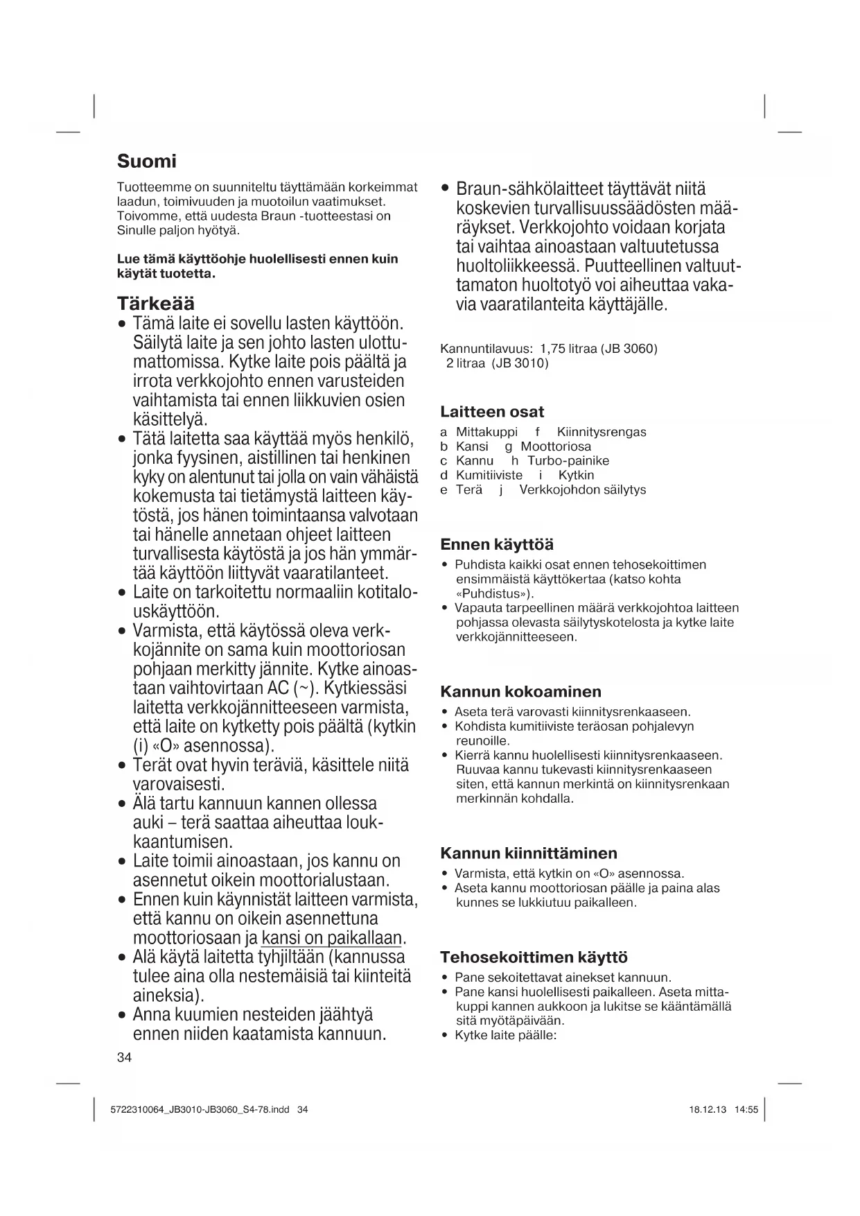 Téléchargez la notice de votre Tehosekoitin au format PDF gratuitement ! Retrouvez votre notice JB 3060 SW - BRAUN et reprennez votre appareil électronique en main. Sur cette page sont publiés tous les documents nécessaires à l'utilisation de votre appareil JB 3060 SW de la marque BRAUN.