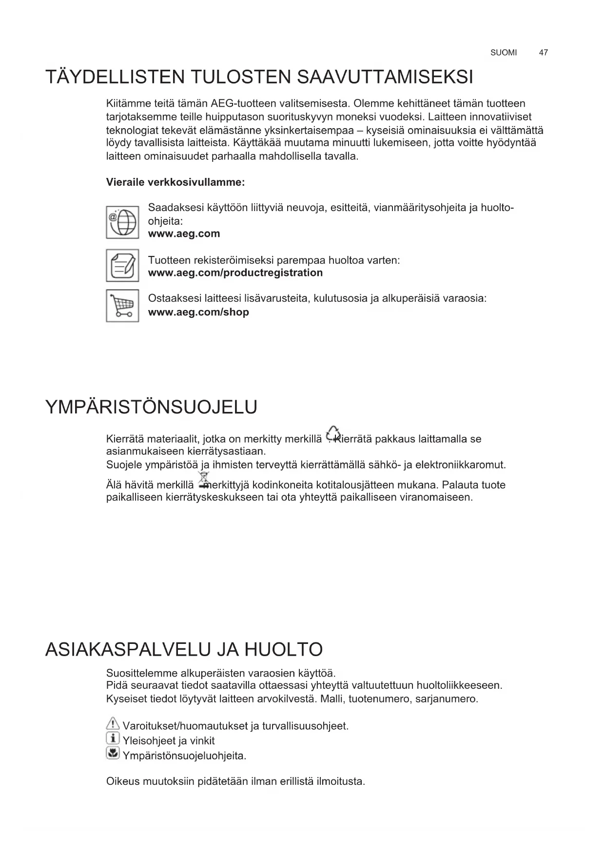 SUOMI TÄYDELLISTEN TULOSTEN SAAVUTTAMISEKSI Kiitämme teitä tämän AEG-tuotteen valitsemisesta. Olemme kehittäneet tämän tuotteen