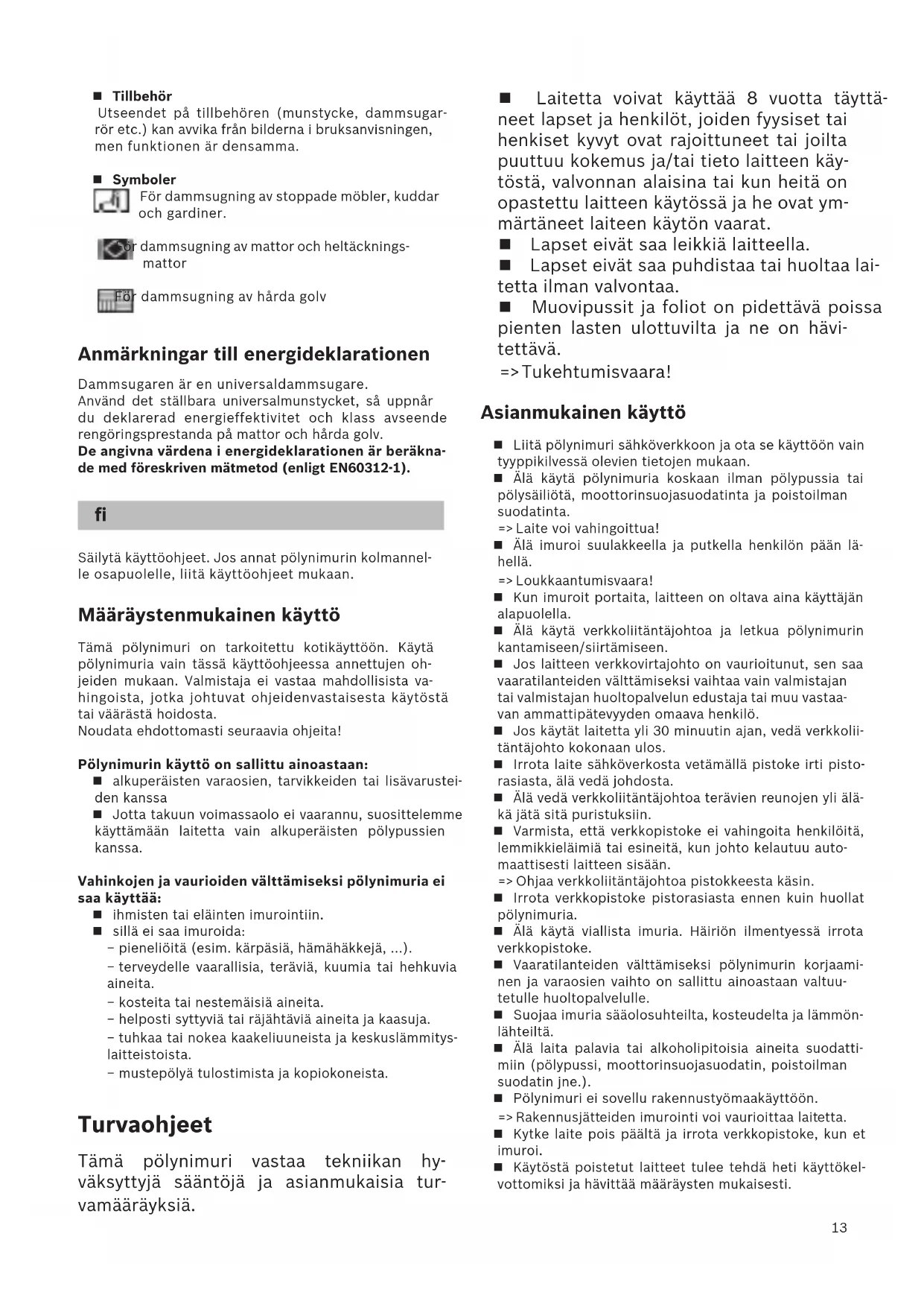 pölynimuria vain tässä käyttöohjeessa annettujen oh-