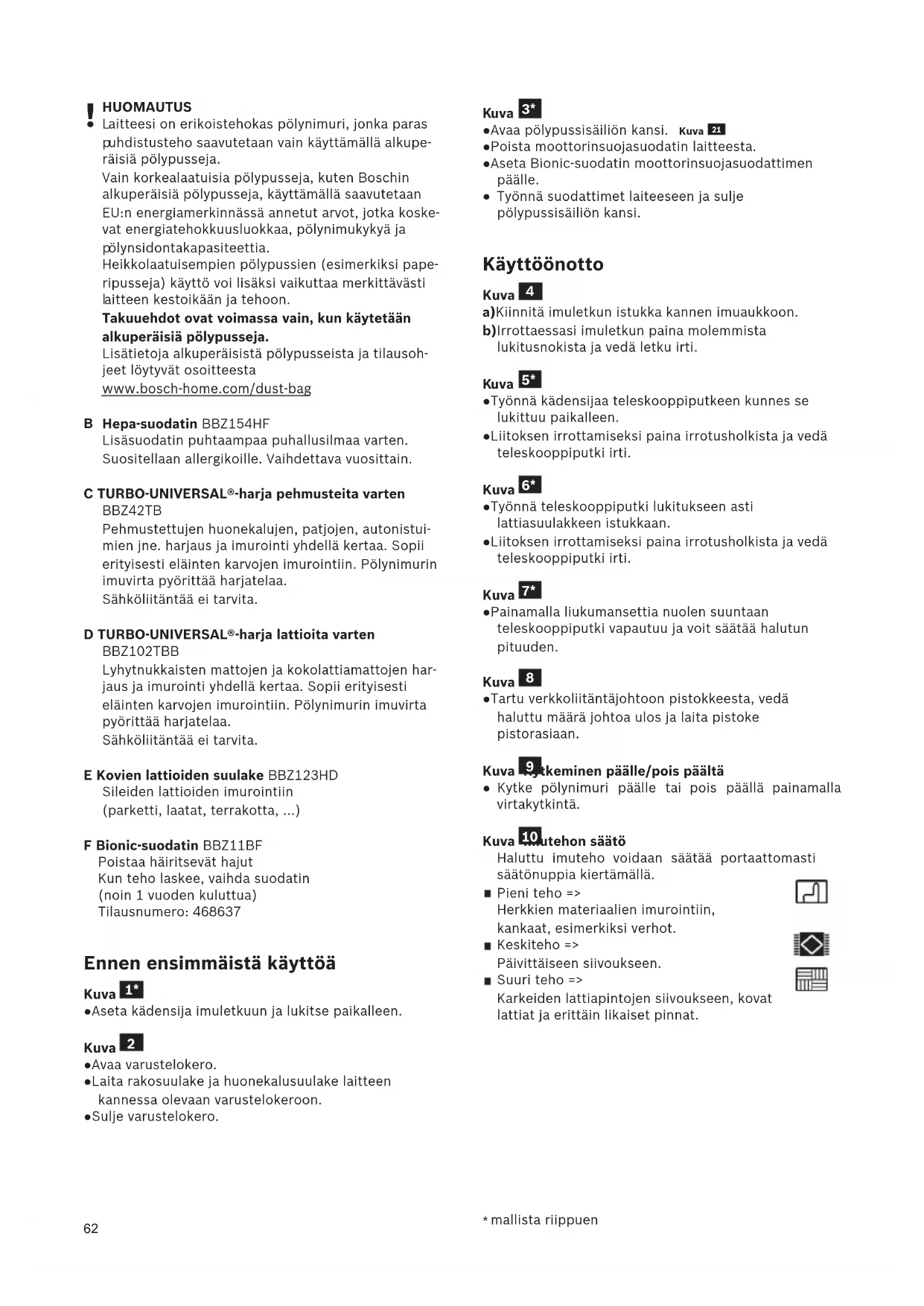 uhdistusteho saavutetaan vain käyttämällä alkupe- räisiä pölypusseja. Vain korkealaatuisia pölypusseja, kuten Boschin alkuperäisiä pölypusseja, käyttämällä saavutetaan EU:n energiamerkinnässä annetut arvot, jotka koske- vat energiatehokkuusluokkaa, pölynimukykyä ja
