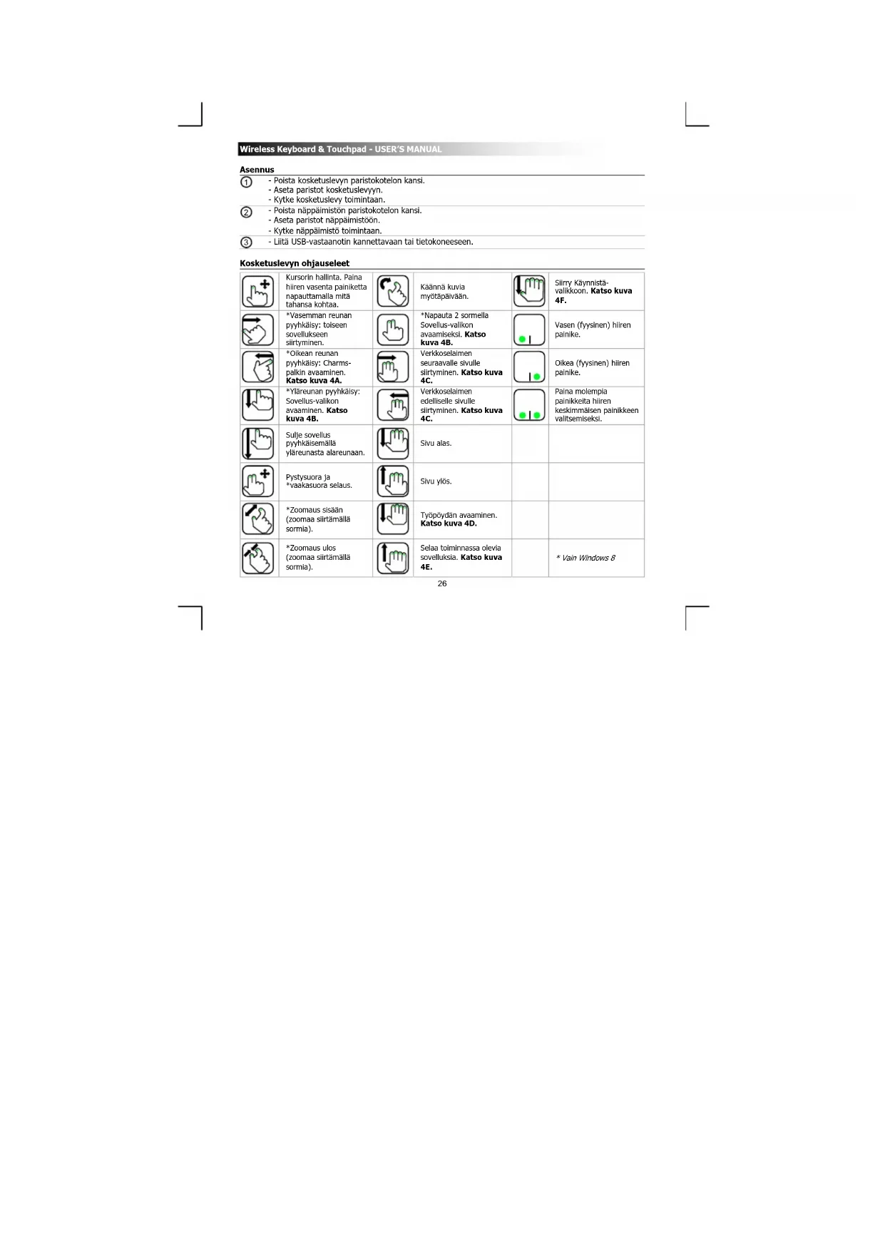 Jotta kaikki eleet toimisivat oikein Windows 8 -käyttöjärjestelmässä, varmista, että kaikki viimeisimmät Windows- ja App Store -päivitykset on asennettu. Näppäimistön medianäppäimet ja merkkivalo Windows 8 Windows 7, Vista ja XP Toista/Tauko Toista/Tauko Mykistys Mykistys Äänenvoimakkuus - Äänenvoimakkuus - Äänenvoimakkuus + Äänenvoimakkuus + Hae (sovelluksia) - Laitteet - Jaa - Asetukset - Windows Käynnistä Windows Käynnistä Paristovirta loppunut -merkkivalo Paristovirta loppunut -merkkivalo Toimintopainikkeita F1~F12 ja sinistä ins(ert)-näppäintä voidaan käyttää painamalla ‘fn’ + erikoisnäppäin.Wireless Keyboard & Touchpad - USER’S MANUAL