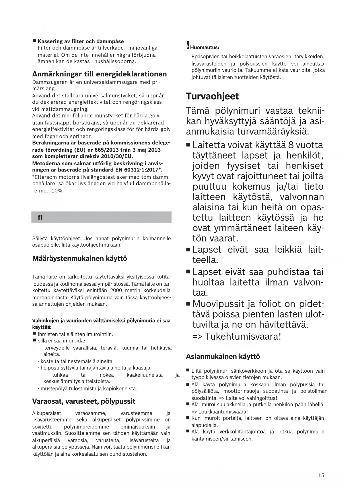 Säilytä käyttöohjeet. Jos annat pölynimurin kolmannelle