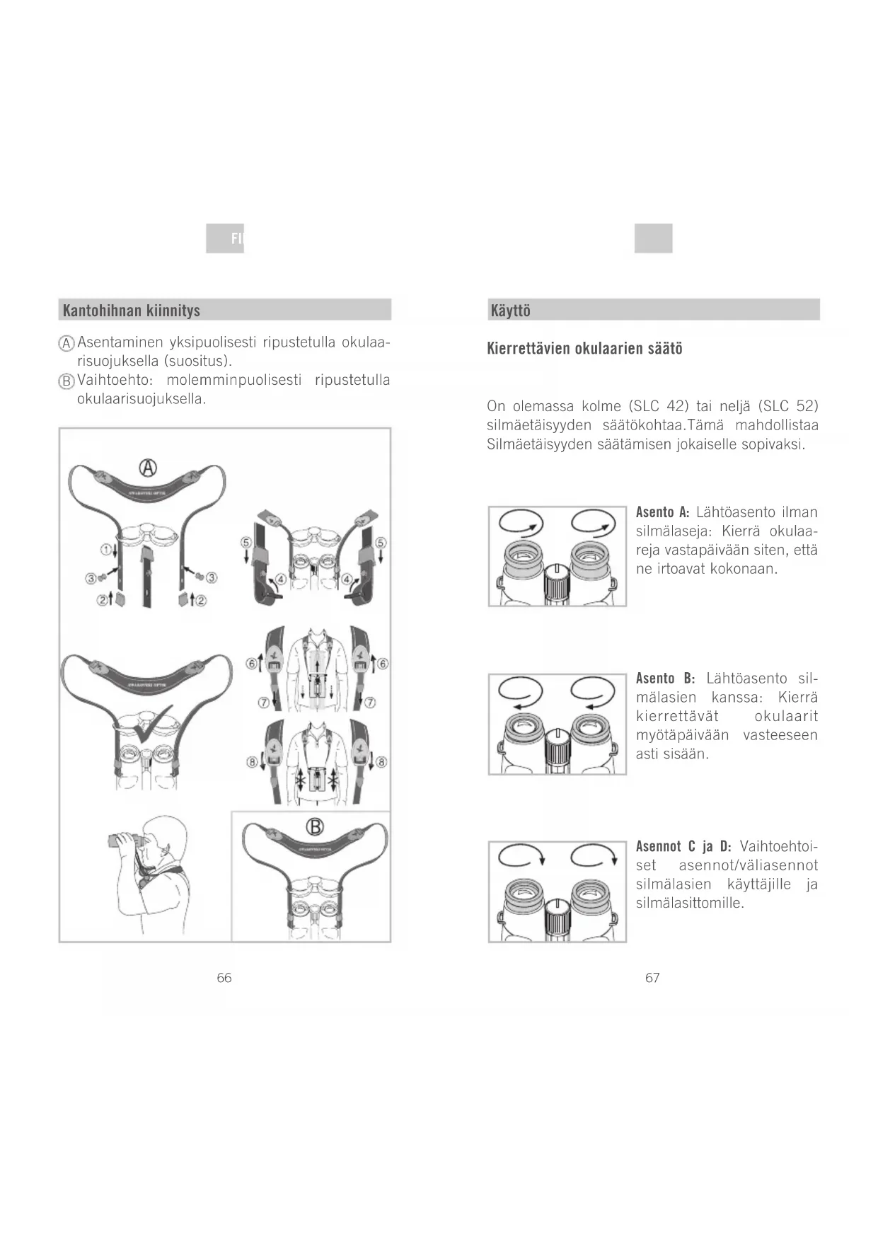 Käyttö Kierrettävien okulaarien säätö On olemassa kolme (SLC 42) tai neljä (SLC 52) silmäetäisyyden säätökohtaa.Tämä mahdollistaa Silmäetäisyyden säätämisen jokaiselle sopivaksi. Asento A: Lähtöasento ilman silmälaseja: Kierrä okulaa- reja vastapäivään siten, että ne irtoavat kokonaan. Asento B: Lähtöasento sil- mälasien kanssa: Kierrä kierrettävät okulaarit myötäpäivään vasteeseen asti sisään. Asennot C ja D: Vaihtoehtoi- set asennot/väliasennot silmälasien käyttäjille ja silmälasittomille.69