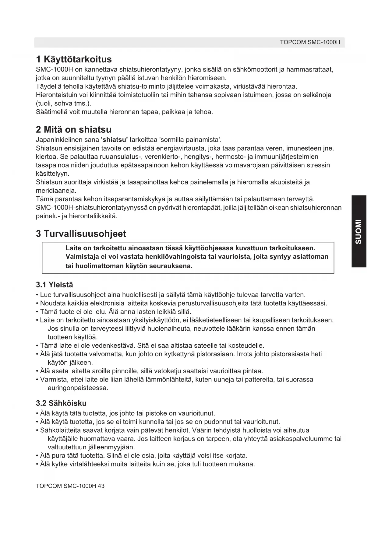 SUOMI 1 Käyttötarkoitus SMC-1000H on kannettava shiatsuhierontatyyny, jonka sisällä on sähkömoottorit ja hammasrattaat, jotka on suunniteltu tyynyn päällä istuvan henkilön hieromiseen. Täydellä teholla käytettävä shiatsu-toiminto jäljittelee voimakasta, virkistävää hierontaa. Hierontaistuin voi kiinnittää toimistotuoliin tai mihin tahansa sopivaan istuimeen, jossa on selkänoja (tuoli, sohva tms.). Säätimellä voit muutella hieronnan tapaa, paikkaa ja tehoa. 2 Mitä on shiatsu Japaninkielinen sana 'shiatsu' tarkoittaa 'sormilla painamista'. Shiatsun ensisijainen tavoite on edistää energiavirtausta, joka taas parantaa veren, imunesteen jne. kiertoa. Se palauttaa ruuansulatus-, verenkierto-, hengitys-, hermosto- ja immuunijärjestelmien tasapainoa niiden jouduttua epätasapainoon kehon käyttäessä voimavarojaan päivittäisen stressin käsittelyyn. Shiatsun suorittaja virkistää ja tasapainottaa kehoa painelemalla ja hieromalla akupisteitä ja meridiaaneja. Tämä parantaa kehon itseparantamiskykyä ja auttaa säilyttämään tai palauttamaan terveyttä. SMC-1000H-shiatsuhierontatyynyssä on pyörivät hierontapäät, joilla jäljitellään oikean shiatsuhieronnan painelu- ja hierontaliikkeitä. 3 Turvallisuusohjeet