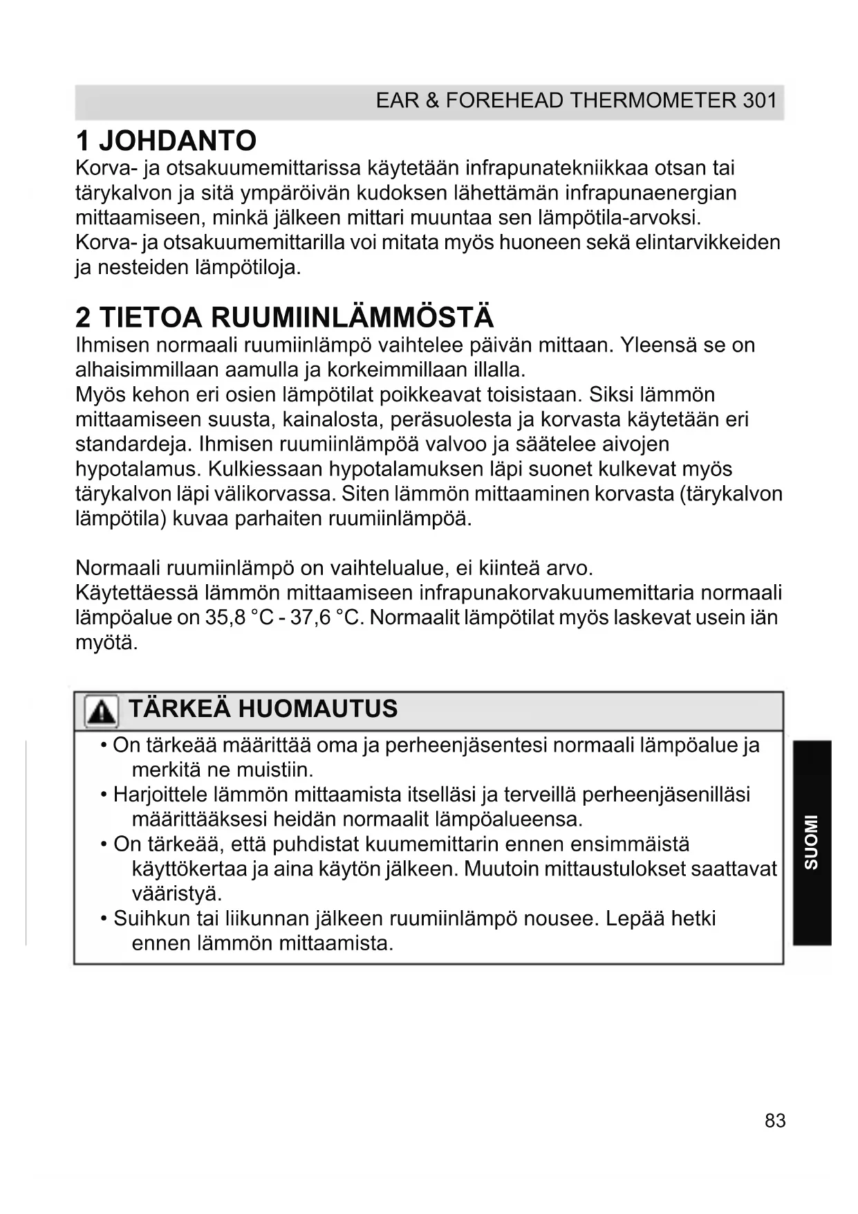SUOMI 1 JOHDANTO Korva- ja otsakuumemittarissa käytetään infrapunatekniikkaa otsan tai tärykalvon ja sitä ympäröivän kudoksen lähettämän infrapunaenergian mittaamiseen, minkä jälkeen mittari muuntaa sen lämpötila-arvoksi. Korva- ja otsakuumemittarilla voi mitata myös huoneen sekä elintarvikkeiden ja nesteiden lämpötiloja.