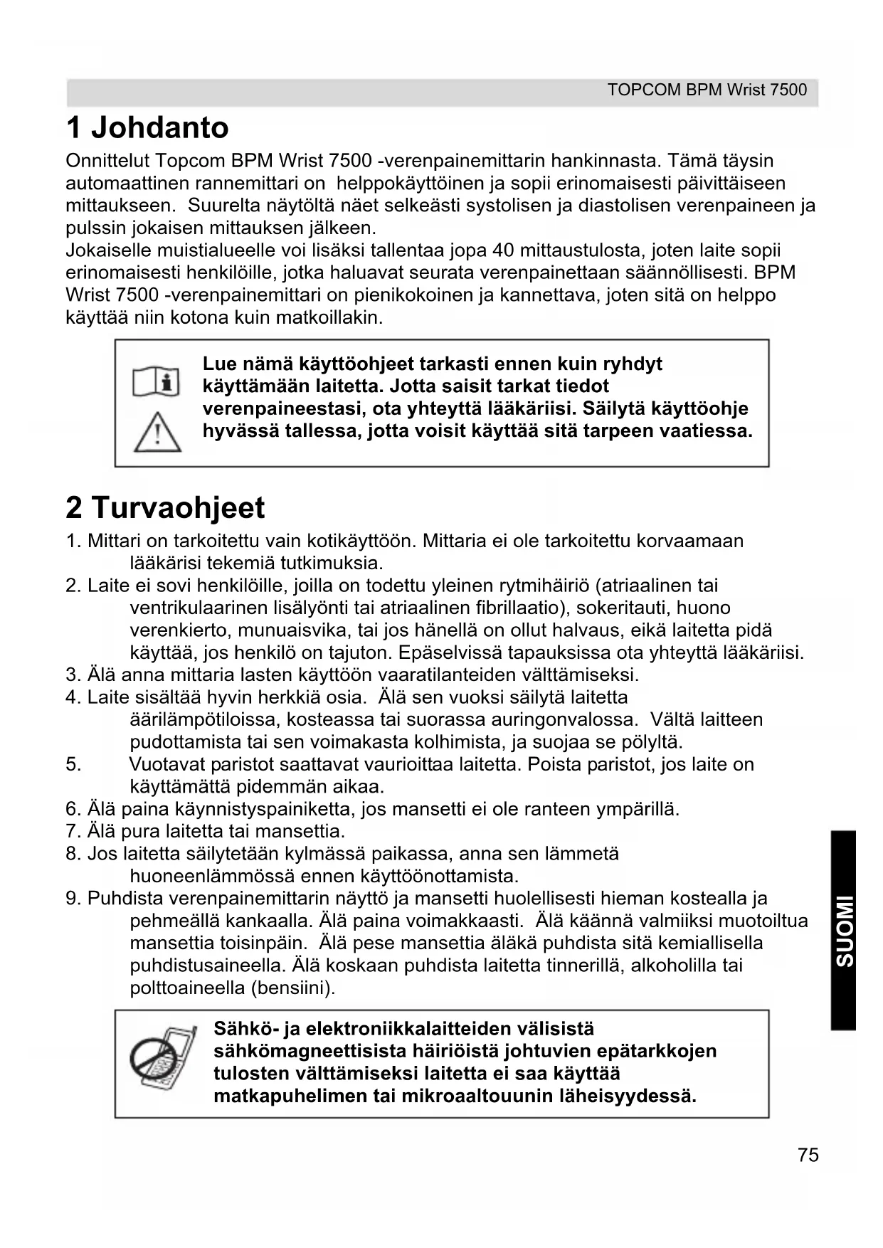 pehmeällä kankaalla. Älä paina voimakkaasti. Älä käännä valmiiksi muotoiltua mansettia toisinpäin. Älä pese mansettia äläkä puhdista sitä kemiallisella puhdistusaineella. Älä koskaan puhdista laitetta tinnerillä, alkoholilla tai polttoaineella (bensiini). Lue nämä käyttöohjeet tarkasti ennen kuin ryhdyt käyttämään laitetta. Jotta saisit tarkat tiedot verenpaineestasi, ota yhteyttä lääkäriisi. Säilytä käyttöohje hyvässä tallessa, jotta voisit käyttää sitä tarpeen vaatiessa. Sähkö- ja elektroniikkalaitteiden välisistä sähkömagneettisista häiriöistä johtuvien epätarkkojen tulosten välttämiseksi laitetta ei saa käyttää matkapuhelimen tai mikroaaltouunin läheisyydessä.76 TOPCOM BPM Wrist 7500 3 Hyödyllisiä vinkkejä Tässä muutamia hyödyllisiä vinkkejä, joiden avulla saat tarkempia mittaustuloksia: