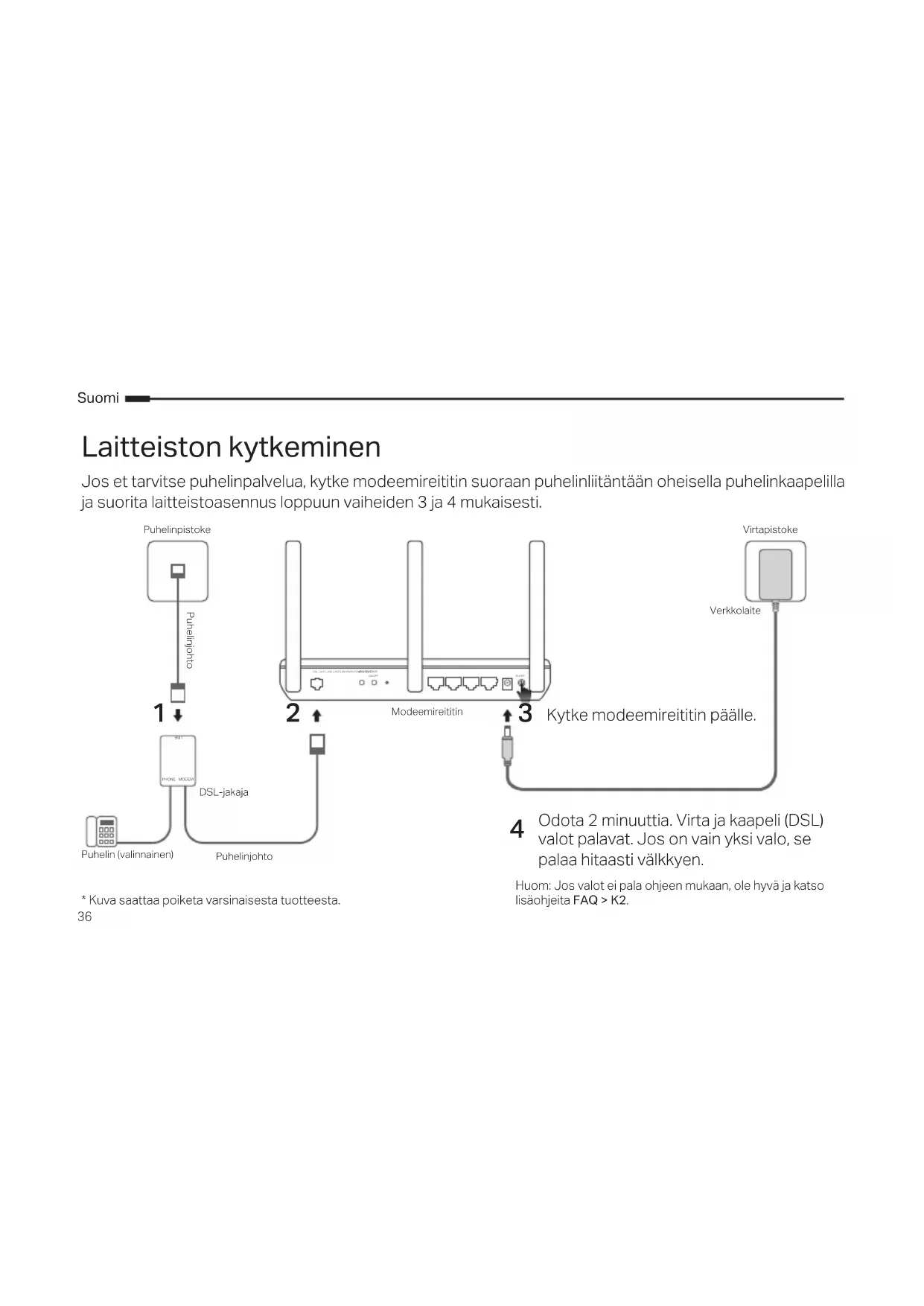 1 2 DSL LAN1 LAN2 LAN3 LAN4/WAN POWER POWERON/OFFWPS RESETWiFiON/OFF* Kuva saattaa poiketa varsinaisesta tuotteesta.Huom: Jos valot ei pala ohjeen mukaan, ole hyvä ja katso lisäohjeita FAQ > K2. Odota 2 minuuttia. Virta ja kaapeli (DSL)