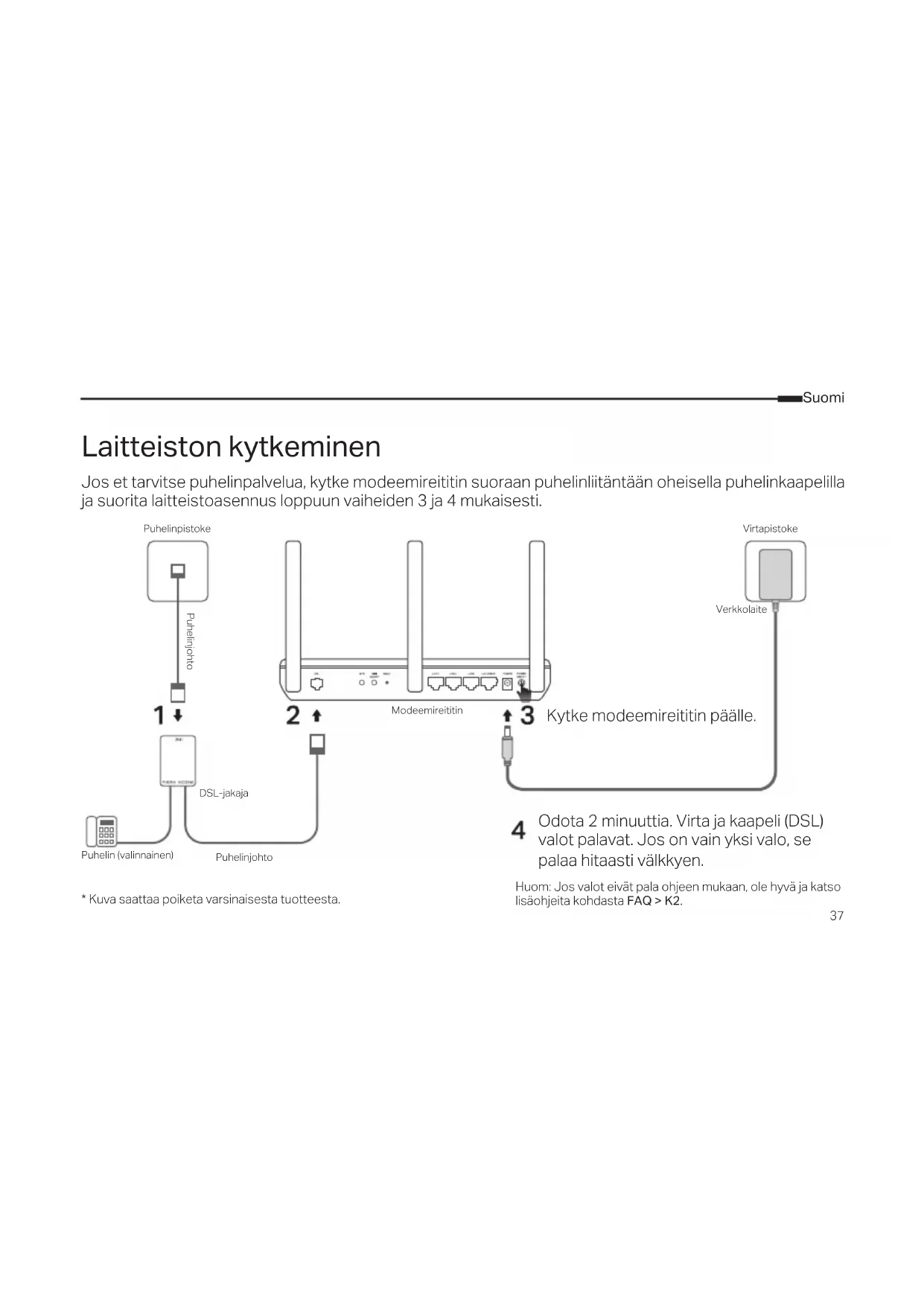 Jos et tarvitse puhelinpalvelua, kytke modeemireititin suoraan puhelinliitäntään oheisella puhelinkaapelilla