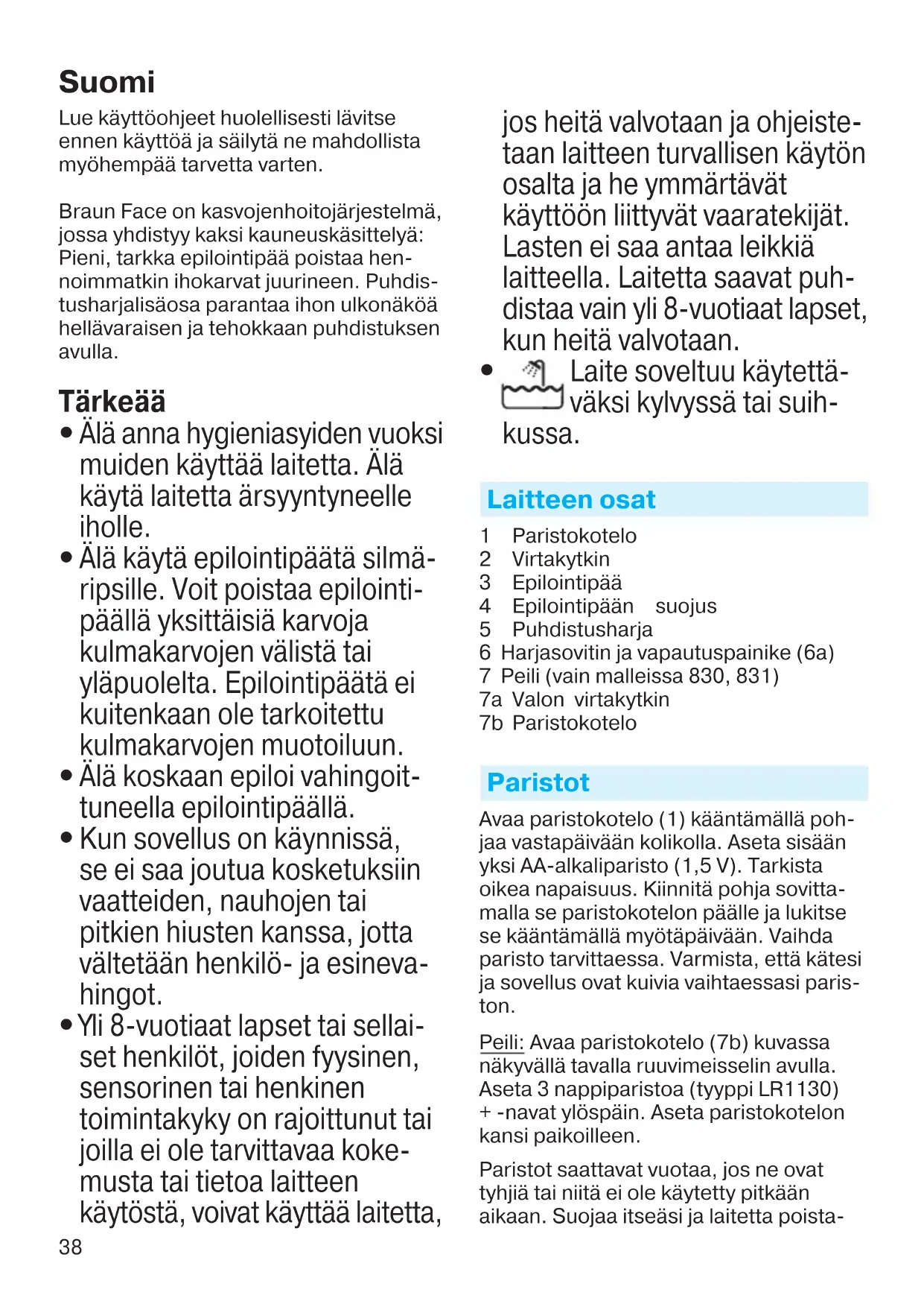 Laite soveltuu käytettä- väksi kylvyssä tai suih- kussa. Laitteen osat 1 Paristokotelo 2 Virtakytkin 3 Epilointipää 4 Epilointipään suojus 5 Puhdistusharja 6 Harjasovitin ja vapautuspainike (6a) 7 Peili (vain malleissa 830, 831) 7a Valon virtakytkin 7b Paristokotelo Paristot Avaa paristokotelo (1) kääntämällä poh- jaa vastapäivään kolikolla. Aseta sisään yksi AA-alkaliparisto (1,5 V). Tarkista oikea napaisuus. Kiinnitä pohja sovitta- malla se paristokotelon päälle ja lukitse se kääntämällä myötäpäivään. Vaihda paristo tarvittaessa. Varmista, että kätesi ja sovellus ovat kuivia vaihtaessasi paris- ton. Peili: Avaa paristokotelo (7b) kuvassa näkyvällä tavalla ruuvimeisselin avulla. Aseta 3 nappiparistoa (tyyppi LR1130) + -navat ylöspäin. Aseta paristokotelon kansi paikoilleen. Paristot saattavat vuotaa, jos ne ovat tyhjiä tai niitä ei ole käytetty pitkään aikaan. Suojaa itseäsi ja laitetta poista- 96892473_SE810_S4-110.indd 3896892473_SE810_S4-110.indd 38 27.02.14 15:3327.02.14 15:33 CSS APPROVED Effective Date 5Mar2014 GMT - Printed 02Oct2014 Page 38 of 11039 malla paristot tarvittaessa. Vältä ihokon- taktia, kun käsittelet vuotavia paristoja. Kasvojen epilointi