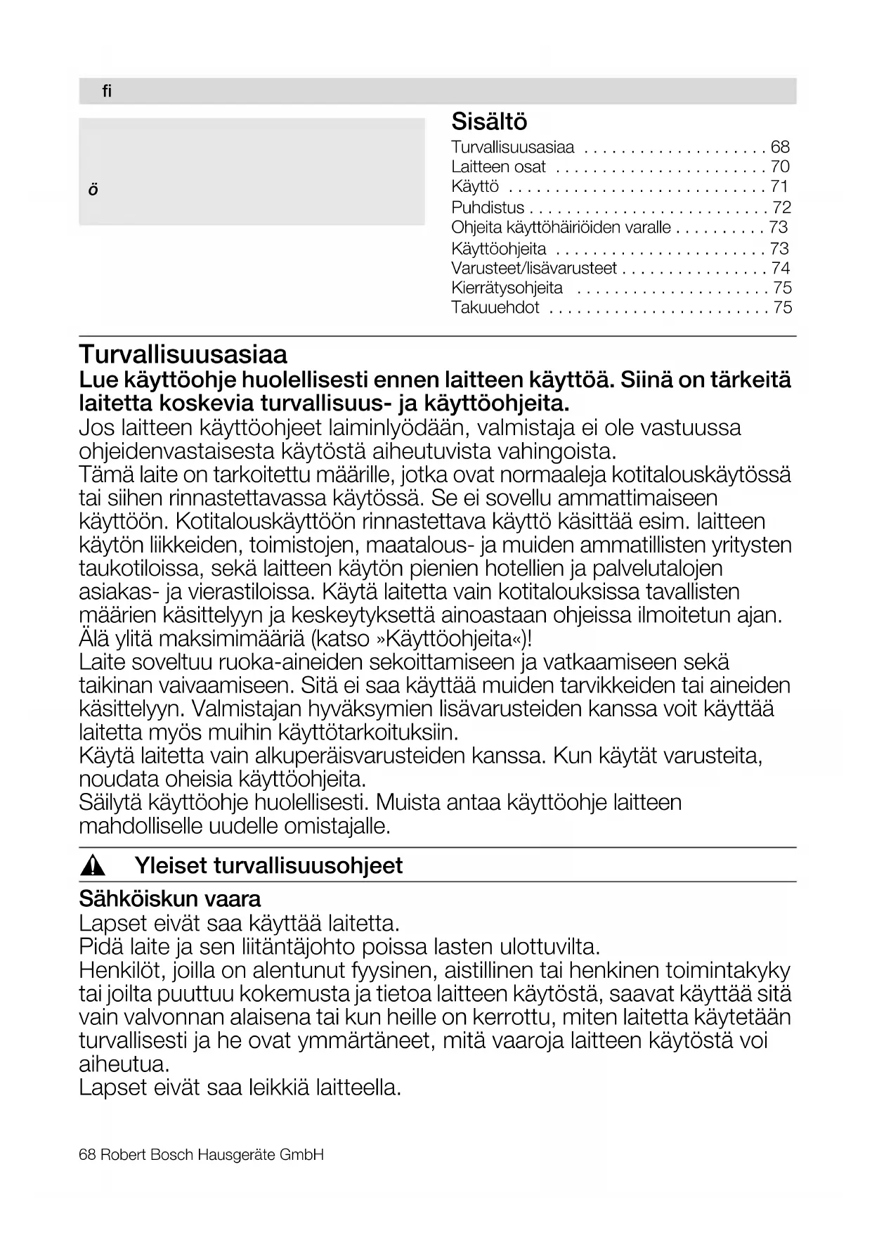 - Takuuehdot Turvallisuusasiaa Lue käyttöohje huolellisesti ennen laitteen käyttöä. Siinä on tärkeitä laitetta koskevia turvallisuus- ja käyttöohjeita. Jos laitteen käyttöohjeet laiminlyödään, valmistaja ei ole vastuussa ohjeidenvastaisesta käytöstä aiheutuvista vahingoista. Tämä laite on tarkoitettu määrille, jotka ovat normaaleja kotitalouskäytössä tai siihen rinnastettavassa käytössä. Se ei sovellu ammattimaiseen käyttöön. Kotitalouskäyttöön rinnastettava käyttö käsittää esim. laitteen käytön liikkeiden, toimistojen, maatalous- ja muiden ammatillisten yritysten taukotiloissa, sekä laitteen käytön pienien hotellien ja palvelutalojen asiakas- ja vierastiloissa. Käytä laitetta vain kotitalouksissa tavallisten määrien käsittelyyn ja keskeytyksettä ainoastaan ohjeissa ilmoitetun ajan. Älä ylitä maksimimääriä (katso »Käyttöohjeita«)! Laite soveltuu ruoka-aineiden sekoittamiseen ja vatkaamiseen sekä taikinan vaivaamiseen. Sitä ei saa käyttää muiden tarvikkeiden tai aineiden käsittelyyn. Valmistajan hyväksymien lisävarusteiden kanssa voit käyttää laitetta myös muihin käyttötarkoituksiin. Käytä laitetta vain alkuperäisvarusteiden kanssa. Kun käytät varusteita, noudata oheisia käyttöohjeita. Säilytä käyttöohje huolellisesti. Muista antaa käyttöohje laitteen mahdolliselle uudelle omistajalle. , Yleiset turvallisuusohjeet Sähköiskun vaara Lapset eivät saa käyttää laitetta. Pidä laite ja sen liitäntäjohto poissa lasten ulottuvilta. Henkilöt, joilla on alentunut fyysinen, aistillinen tai henkinen toimintakyky tai joilta puuttuu kokemusta ja tietoa laitteen käytöstä, saavat käyttää sitä vain valvonnan alaisena tai kun heille on kerrottu, miten laitetta käytetään turvallisesti ja he ovat ymmärtäneet, mitä vaaroja laitteen käytöstä voi aiheutua. Lapset eivät saa leikkiä laitteella. p. 75