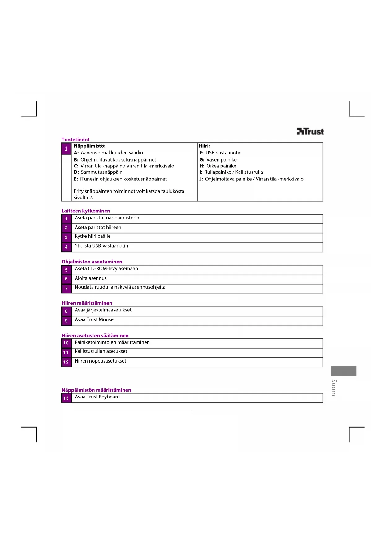 Tuotetiedot Näppäimistö: A: Äänenvoimakkuuden säädin B: Ohjelmoitavat kosketusnäppäimet C: Virran tila -näppäin / Virran tila -merkkivalo D: Sammutusnäppäin E: iTunesin ohjauksen kosketusnäppäimet Erityisnäppäinten toiminnot voit katsoa taulukosta sivulta 2. Hiiri: F: USB-vastaanotin G: Vasen painike H: Oikea painike I: Rullapainike / Kallistusrulla J: Ohjelmoitava painike / Virran tila -merkkivalo Laitteen kytkeminen Aseta paristot näppäimistöön Aseta paristot hiireen Kytke hiiri päälle Yhdistä USB-vastaanotin Ohjelmiston asentaminen Aseta CD-ROM-levy asemaan Aloita asennus Noudata ruudulla näkyviä asennusohjeita Hiiren määrittäminen Avaa järjestelmäasetukset Avaa Trust Mouse Hiiren asetusten säätäminen Painiketoimintojen määrittäminen Kallistusrullan asetukset Hiiren nopeusasetukset