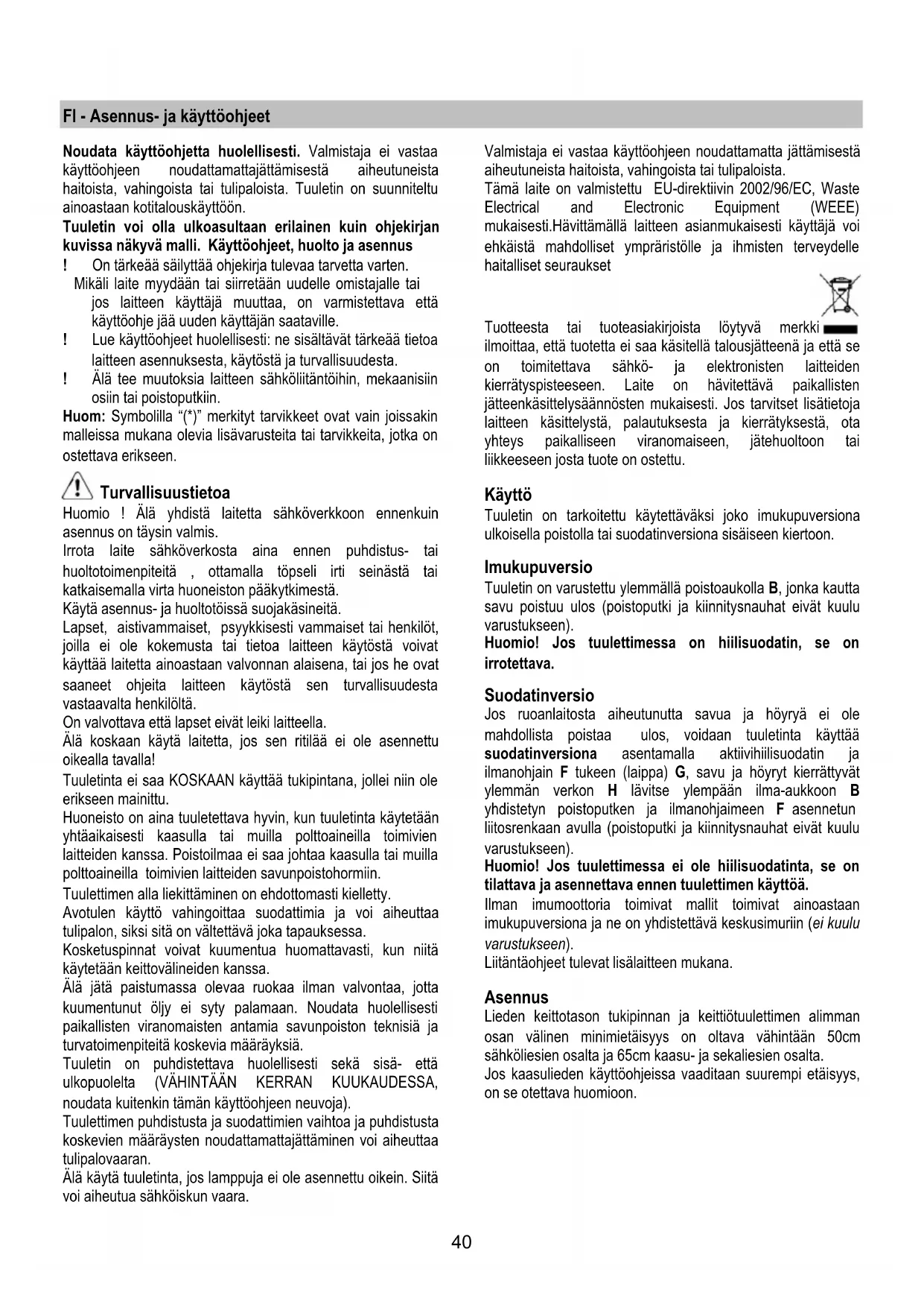 Noudata käytöohjetta huolellisesti. Valmistaja ei vastaa käytöohjeen noudattamattajättämisetä aiheituneista haitoista, vahingoista tai tulipaloista. Tuuletin on suunnitelu ainoastaan kotitalouskäyttoön.
