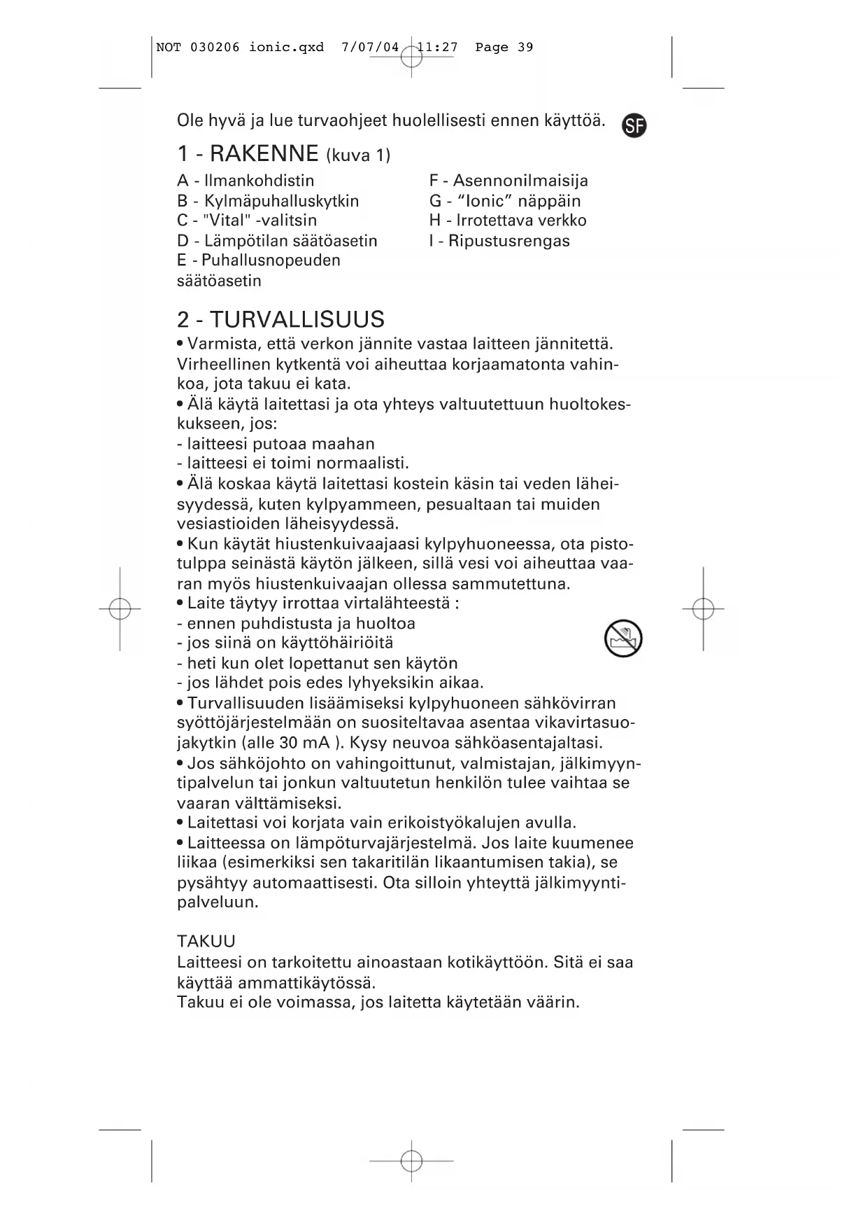 A - Ilmankohdistin B - Kylmäpuhalluskytkin C - "Vital" -valitsin D - Lämpötilan säätöasetin E - Puhallusnopeuden säätöasetin F - Asennonilmaisija G - “Ionic” näppäin H - Irrotettava verkko I - Ripustusrengas NOT 030206 ionic.qxd 7/07/04 11:27 Page 39SF