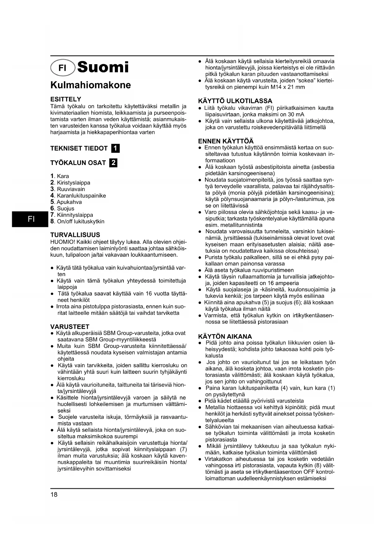 ● Älä koskaan käytä sellaisia kierteitysreikiä omaavia hionta/jyrsintälevyjä, joissa kierteistys ei ole riittävän pitkä työkalun karan pituuden vastaanottamiseksi● Älä koskaan käytä varusteita, joiden “sokea” kiertei-tysreikä on pienempi kuin M14 x 21 mmKÄYTTÖ ULKOTILASSA● Liitä työkalu vikavirran (FI) piirikatkaisimen kautta liipaisuvirtaan, jonka maksimi on 30 mA● Käytä vain sellaista ulkona käytettävää jatkojohtoa, joka on varustettu roiskevedenpitävällä liittimelläENNEN KÄYTTÖÄ● Ennen työkalun käyttöä ensimmäistä kertaa on suo-siteltavaa tutustua käytännön toimia koskevaan in-formaatioon● Älä koskaan työstä asbestipitoista ainetta (asbestia pidetään karsinogeenisena)● Noudata suojatoimenpiteitä, jos työssä saattaa syn-tyä terveydelle vaarallista, palavaa tai räjähdysaltis-ta pölyä (monia pölyjä pidetään karsinogeenisina); käytä pölynsuojanaamaria ja pölyn-/lastunimua, jos se on liitettävissä● Varo piilossa olevia sähköjohtoja sekä kaasu- ja ve-siputkia; tarkasta työskentelyalue käyttämällä apuna esim. metallitunnistinta● Noudata varovaisuutta tunneleita, varsinkin tukisei-nämiä, jyrsittäessä (tukiseinämissä olevat lovet ovat kyseisen maan erityisasetusten alaisia; näitä ase-tuksia on noudatettava kaikissa olosuhteissa)● Purista työkalu paikalleen, sillä se ei ehkä pysy pai-kallaan oman painonsa varassa● Älä aseta työkalua ruuvipuristimeen● Käytä täysin rullaamattomia ja turvallisia jatkejohto-ja, joiden kapasiteetti on 16 ampeeria● Käytä suojalaseja ja -käsineitä, kuulonsuojaimia ja tukevia kenkiä; jos tarpeen käytä myös esiliinaa● Kiinnitä aina apukahva (5) ja suojus (6); älä koskaan käytä työkalua ilman näitä● Varmista, että työkalun kytkin on irtikytkentäasen-nossa se liitettäessä pistorasiaanKÄYTÖN AIKANA● Pidä johto aina poissa työkalun liikkuvien osien lä-heisyydestä; kohdista johto takaosaa kohti pois työ-kalusta● Jos johto on vaurioitunut tai jos se leikataan työn aikana, älä kosketa johtoa, vaan irrota kosketin pis-torasiasta välittömästi; älä koskaan käytä työkalua, jos sen johto on vahingoittunut● Paina karan lukituspainiketta (4) vain, kun kara (1) on pysäytettynä● Pidä kädet etäällä pyörivistä varusteista● Metallia hiottaessa voi kehittyä kipinöitä; pidä muut henkilöt ja herkästi syttyvät ainekset poissa työsken-telyalueelta● Sähkövian tai mekaanisen vian aiheutuessa katkai-se työkalun toiminta välittömästi ja irrota kosketin pistorasiasta● Mikäli jyrsintälevy tukkeutuu ja saa työkalun nyki-mään, katkaise työkalun toiminta välittömästi● Virtakatkon aiheutuessa tai jos kosketin vedetään vahingossa irti pistorasiasta, vapauta kytkin (8) välit-tömästi ja aseta se irtikytkentäasentoon OFF kontrol-loimattoman uudelleenkäynnistyksen estämiseksi Kulmahiomakone ESITTELYTämä työkalu on tarkoitettu käytettäväksi metallin ja kivimateriaalien hiomista, leikkaamista ja purseenpois-tamista varten ilman veden käyttämistä; asianmukais-ten varusteiden kanssa työkalua voidaan käyttää myös harjaamista ja hiekkapaperihiontaa vartenTEKNISET TIEDOT 1 TYÖKALUN OSAT 2 1. Kara2. Kiristyslaippa3. Ruuviavain4. Karanlukituspainike5. Apukahva6. Suojus7. Kiinnityslaippa8. On/off lukituskytkinTURVALLISUUSHUOMIO! Kaikki ohjeet täytyy lukea. Alla olevien ohjei-den noudattamisen laiminlyönti saattaa johtaa sähköis-kuun, tulipaloon ja/tai vakavaan loukkaantumiseen. ● Käytä tätä työkalua vain kuivahuiontaa/jyrsintää var- ten ● Käytä vain tämä työkalun yhteydessä toimitettuja laippoja● Tätä työkalua saavat käyttää vain 16 vuotta täyttä-neet henkilöt● Irrota aina pistotulppa pistorasiasta, ennen kuin suo-ritat laitteelle mitään säätöjä tai vaihdat tarvikettaVARUSTEET● Käytä alkuperäisiä SBM Group-varusteita, jotka ovat saatavana SBM Group-myyntiliikkeestä● Muita kuin SBM Group-varusteita kiinnitettäessä/käytettäessä noudata kyseisen valmistajan antamia ohjeita● Käytä vain tarvikkeita, joiden sallittu kierrosluku on vähintään yhtä suuri kuin laitteen suurin tyhjäkäynti kierrosluku● Älä käytä vaurioituneita, taittuneita tai täriseviä hion-ta/jyrsintälevyjä● Käsittele hionta/jyrsintälevyjä varoen ja säilytä ne huolellisesti lohkeilemisen ja murtumisen välttämi-seksi● Suojele varusteita iskuja, törmäyksiä ja rasvaantu-mista vastaan● Älä käytä sellaista hionta/jyrsintälevyä, joka on suo-siteltua maksimikokoa suurempi● Käytä sellaisin reikähalkaisijoin varustettuja hionta/jyrsintälevyjä, jotka sopivat kiinnityslaippaan (7) ilman muita varustuksia; älä koskaan käytä kaven-nuskappaleita tai muuntimia suurireikäisiin hionta/jyrsintälevyihin sovittamiseksi