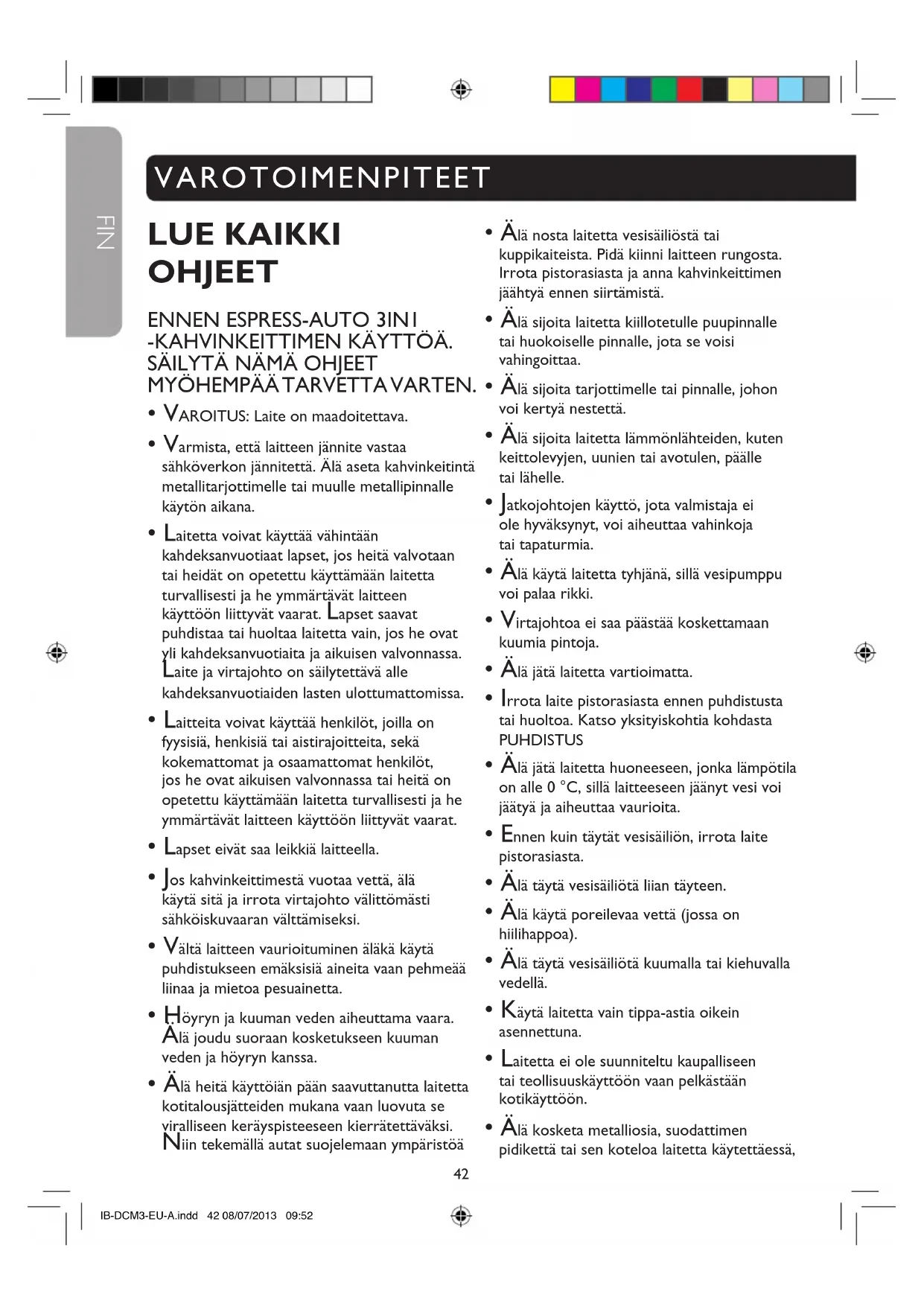 suodattimet, vesisäiliö ja vaahtosuutin täytyy pestä pesuaineella ja haalealla vedellä, huuhdella ja kuivata. IB-DCM3-EU-A.indd 43 08/07/2013 09:5245