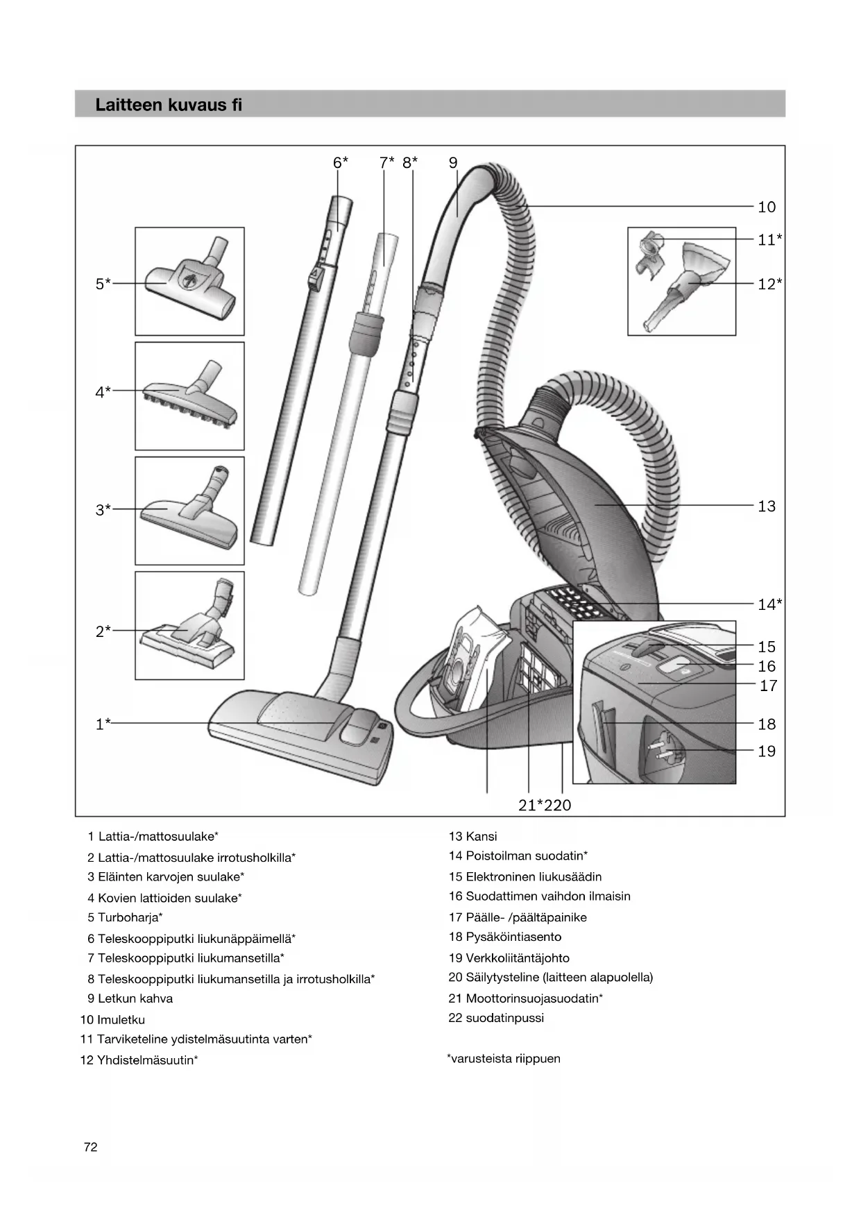Pölynimuria ja muovisia lisävarusteita voidaan hoitaa