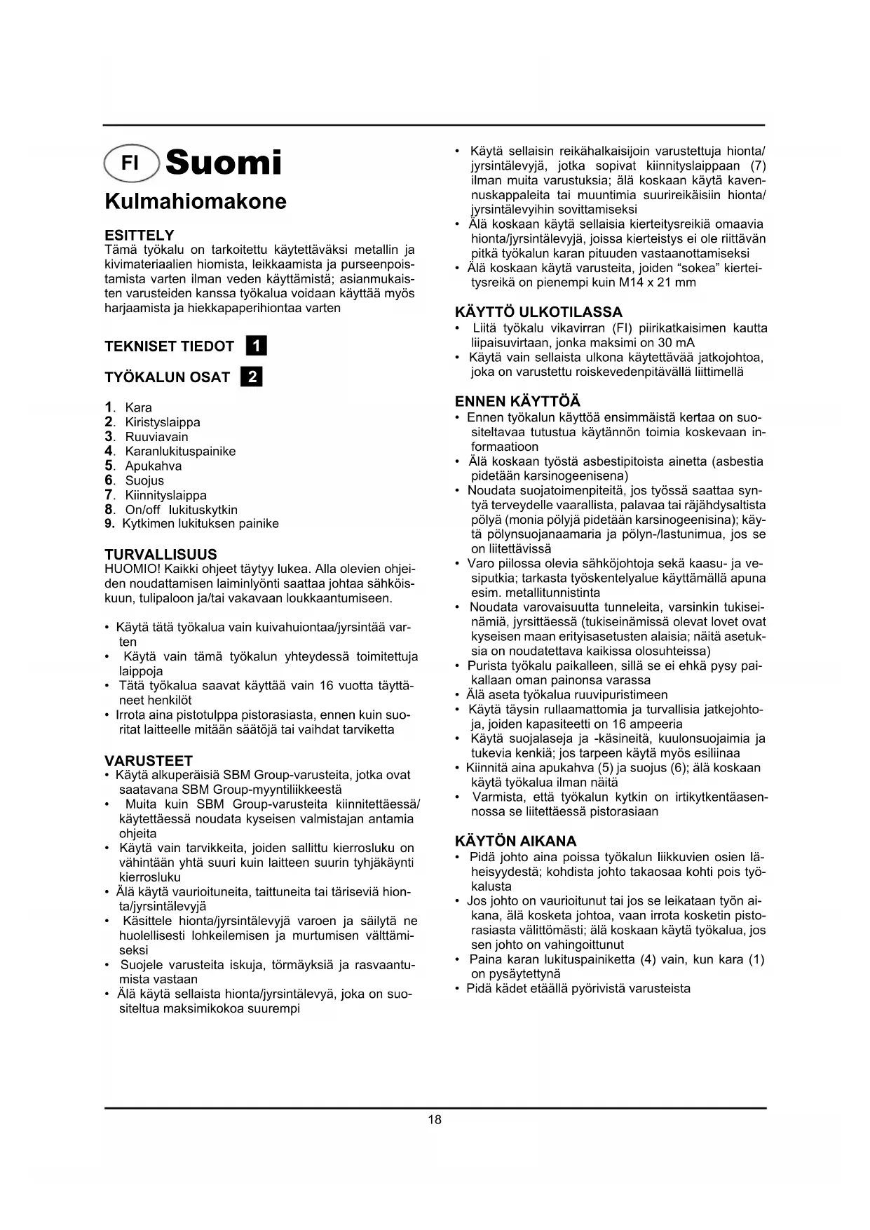 Suomi Kulmahiomakone ESITTELY Tämä työkalu on tarkoitettu käytettäväksi metallin ja kivimateriaalien hiomista, leikkaamista ja purseenpois-tamista varten ilman veden käyttämistä; asianmukais-ten varusteiden kanssa työkalua voidaan käyttää myös harjaamista ja hiekkapaperihiontaa varten TEKNISET TIEDOT 1