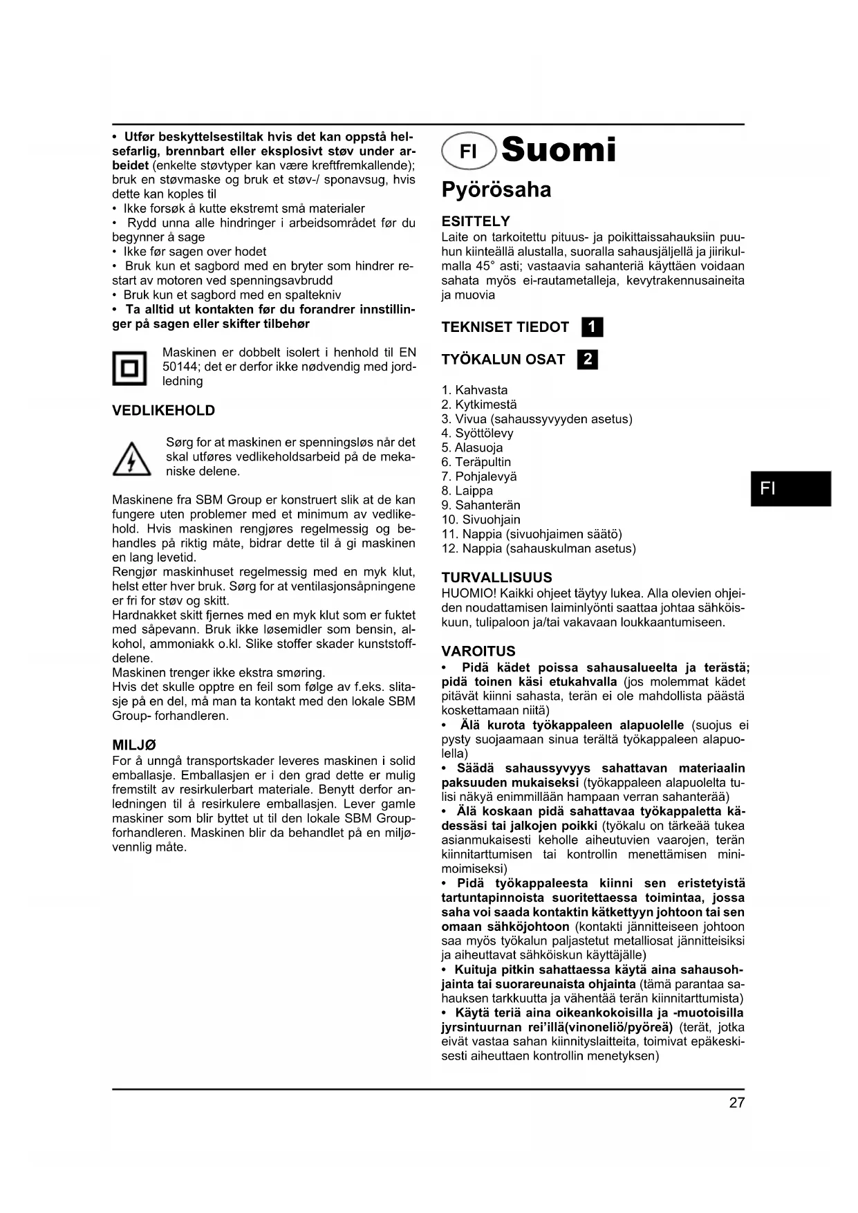 - et valitud lõikepositsioonid oleksid kindlalt fi kseeritud (lõike ajal fi kseeringust vabanenud saeketas võib põh- justada selle kinnikiilumist või tööõnnetust);• Älä käytä hionta- tai jyrsintälevyjä tämän koneen kanssa• Älä koskaan työstä asbestipitoista ainetta (as-bestia pidetään karsinogeenisena)• Noudata suojatoimenpiteitä, jos työssä saattaa syntyä terveydelle vaarallista, palavaa tai räjähdys-altista pölyä (monia pölyjä pidetään karsinogeenisina); käytä pölynsuojanaamaria ja pölyn-/ lastunimua, jos se on liitettävissä• Älä sahaa pieniä työkappaleita• Poista kaikki esteet sahauslinjan ylä- ja alapuolelta ennen sahausta• Älä käytä sahaa pään yläpuolella• Käytä ainoastaan sahauspöytää, jossa on kytkin, joka estää moottorin uudelleen käynnistymisen sähkö-katkon jälkeen• Käytä ainoastaan sahauspöytää, jossa on halkaisu-kiilaa• Irrota aina pistotulppa pistorasiasta, ennen kuin suoritat laitteelle mitään säätöjä tai vaihdat tarviket- Koneessa on kaksinkertainen eristys EN50144:n mukaan; maadoitusjohto ei ole tarpeellinen.HUOLTOIrrota aina kone virtalähteestä ennen huollon aloittamista.SBM Group-koneet on suunniteltu toimimaan pitkään ja mahdollisimman pienellä huoltotarpeella. Puhdis-tamalla ja käyttämällä sitä oikealla tavalla voit itsekin vaikuttaa koneen käyttöikään.Puhdista koneen ulkopinta säännöllisesti pehmeällä kankaalla. Parasta olisi puhdistaa se jokaisen käyttö-kerran jälkeen. Pidä koneen jäähdytysaukot puhtaina.Jos lika on pinttynyt, voit käyttää saippuavedellä kos-tutettua kangaspalaa. Älä kuitenkaan käytä liuottimia kuten bensiiniä, alkoholia, ammoniakkia jne, koska ne vahingoittavat koneen muoviosia.Konetta ei tarvitse voidella.Jos koneen toiminnassa ilmenee häiriö esim. jonkin osan kulumisen johdosta, ota yhteyttä lähimpään SBM Group-jälleenmyyjään.YMPÄRISTÖKuljetusvaurioiden välttämiseksi kone on pakattu tu-kevaan laatikkoon. Tämä pakkaus on mahdollisimman ympäristöystävällinen. Kierrätä se. Jos vaihdat koneen uuteen, voit viedä vanhan koneen SBM Group-jälleen-myyjällesi, joka huolehtii ympäristöystävällisestä jäte-huollosta.